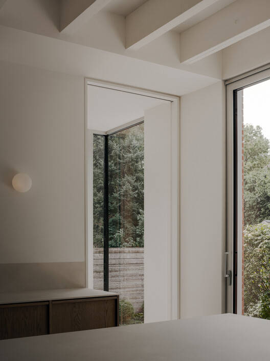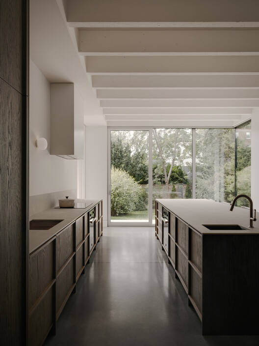 在新的附属建筑中,这座百年老房子的特点以现代的方式重新诠释。例如,彩色木饰面和踢脚板的比例暗示了这座历史建筑。小玻璃窗现在让位于大的角落开口,将室内空间沐浴在自然光中,并从现有的一楼房间欣赏到花园的美景。室内采用受原始美学启发的材料调色板,利用木材的温暖和混凝土的寒冷之间的内在对比;橡木的微妙和烧结石的砂砾之间。厨房天花板由裸露的涂漆木托梁制成,增加了质感和深度。它们在视觉上标出了路径,并构建了潜在的干预措施。