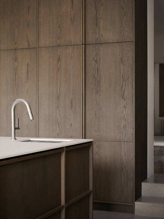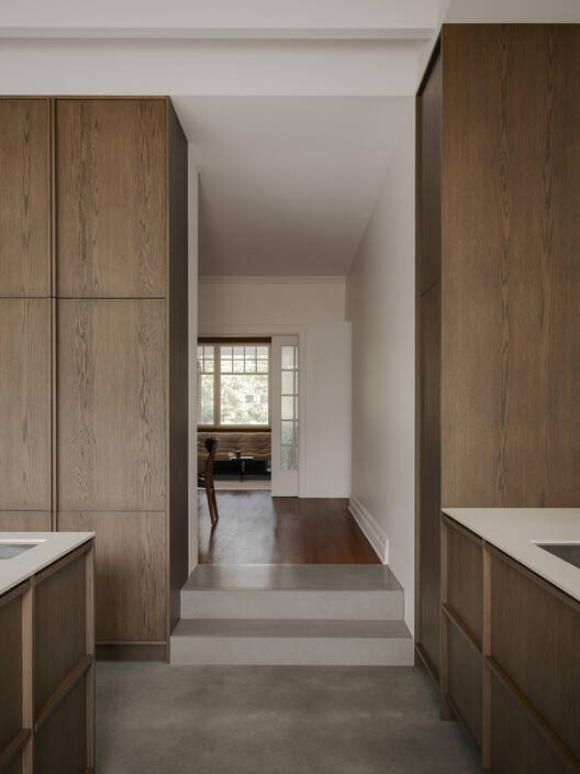 设计精髓:该项目的精髓在于“新”与“旧”的对话和平衡。设计者并没有简单地推倒重建,而是通过精心的改造和扩建,保留了原建筑的特色,同时满足了现代生活的需求。 材料的选择也体现了这种平衡,木材的温暖与混凝土的冷峻相互映衬,橡木的细腻与烧结石的粗犷相互对比,这种对比既丰富了空间的层次感,又强调了新旧之间的对话。此外,对细节的关注也体现了设计的精髓,例如对原始硬木地板、装饰线和窗户的修复和保留,都体现了设计者对历史的敬意。