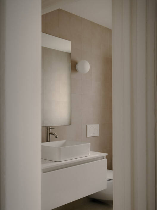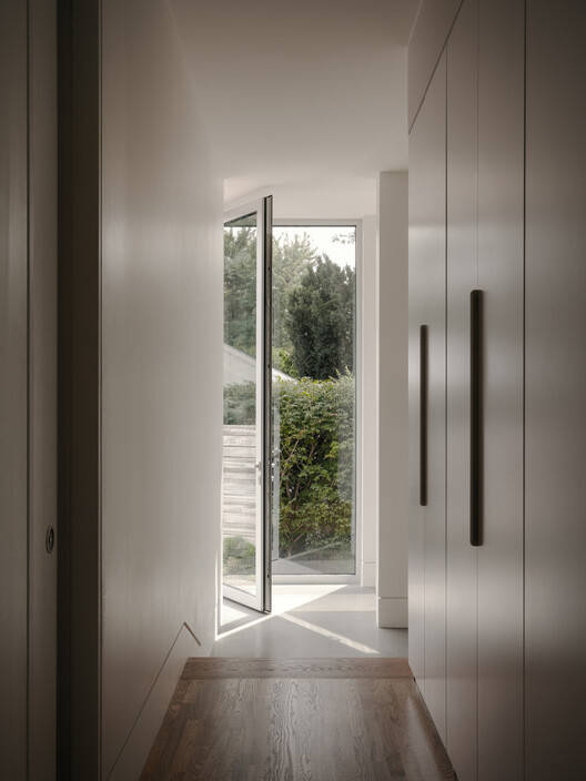 在历史悠久的房屋内实现现代融合的愿望也反映在实施技术解决方案以满足建筑要求,同时不损害居住者的舒适度和建筑性能。因此,为了满足业主对充足窗户的需求,建议采用更精确的方法来定位开口,并在选择高性能产品时格外小心,包括特别厚的三层玻璃单元。水力辐射地板为新的混凝土板供暖,辅以由热泵供电的中央供暖和空调系统。这里的目标是在当代和历史空间中无缝地实现这些机械部件。