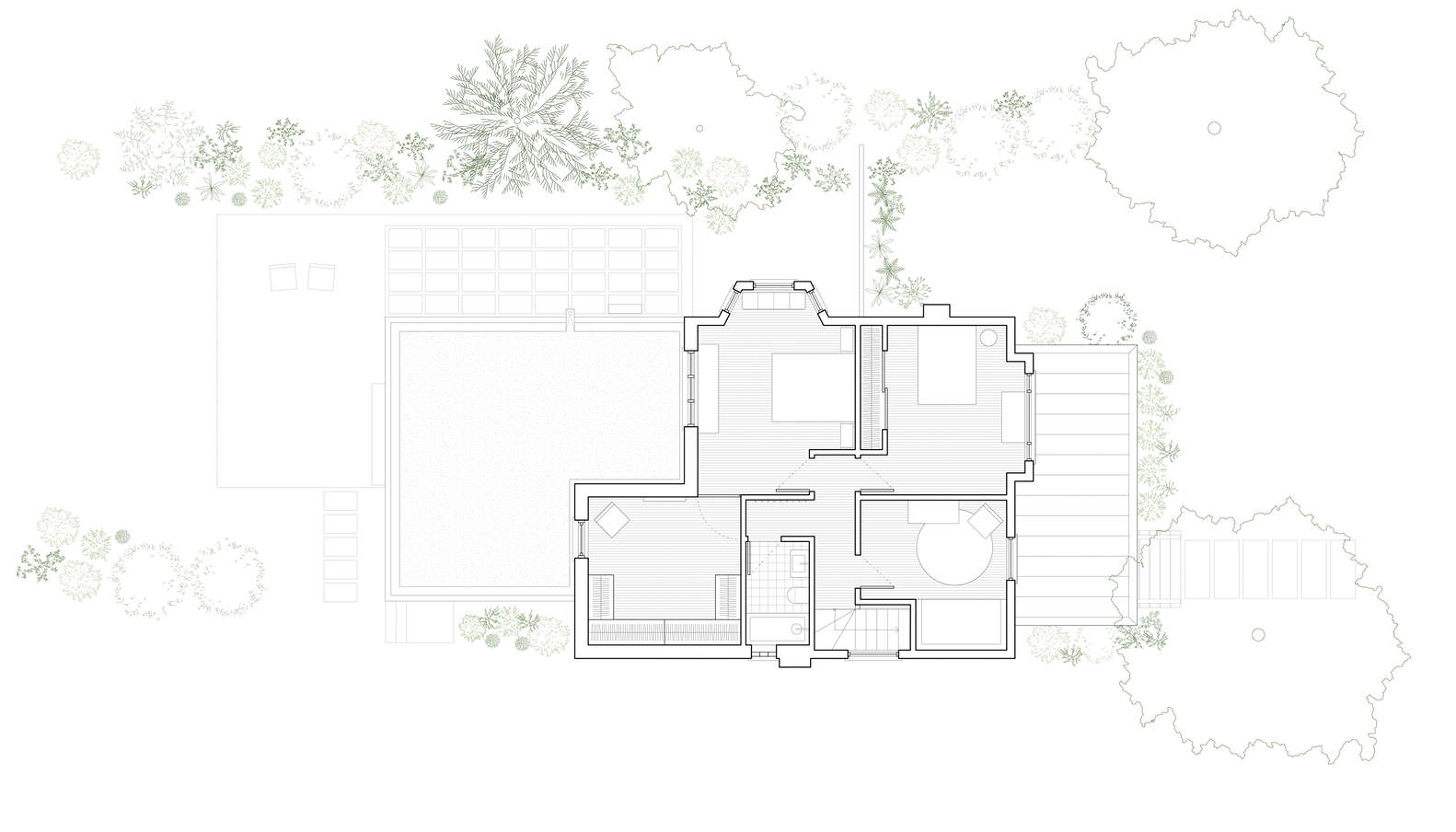 In respect to the already intimate character of the upper floor, interventions here are minimal. These include restoring original components such as hardwood floors, moldings, and windows, and reorganizing certain openings to optimize circulation.