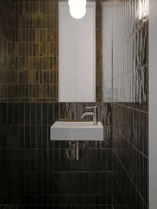 这个延伸既陌生又熟悉,既神秘又明显,没有对抗就脱颖而出。大胆的砖石棱柱,与原始的材料相呼应,新的体量与世纪之交的建筑形成了正式的对比,冷静地用金属板顶盖加冕,让人联想到相邻的斜屋顶。立面反映了室内的功能,由实心和空心平面组成,在砖和玻璃、重力和轻盈之间交替。