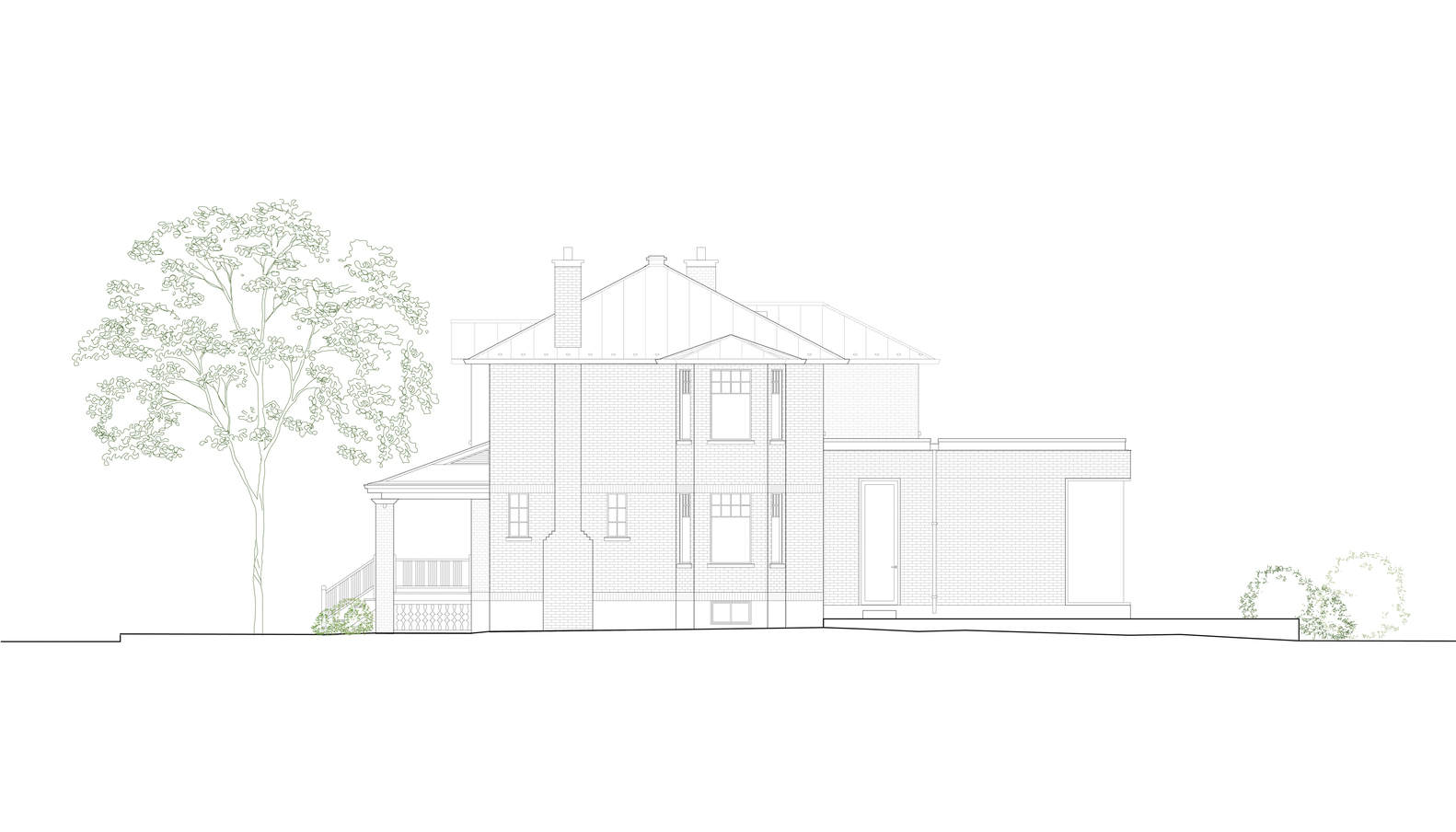 Without losing the character of this residence, the challenge was to respect the existing structure by emphasizing its qualities, while carrying out well-balanced interventions to adapt the building to today's wishes and needs. In attempting to correct certain anomalies of previous interventions, the aim was more specifically to offer spaces that were fluid, luminous, uncluttered, spacious, and open in the yard. In addition to the work carried out on the original building, a compact volume was built towards the rear of the property, in the shade of the garden, to accommodate a kitchen.