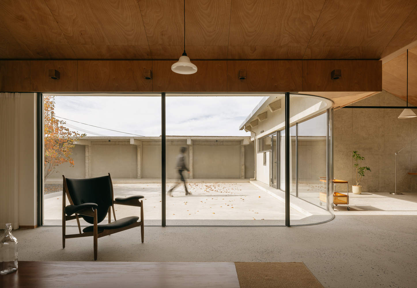 虽然房子对庭院保持开放和透明,但它的外立面却恰恰相反。唯一面向外部的立面本身就是航站楼空间之一。入口半室外空间沿着倾斜的屋顶向下延伸,而砖砌围墙则随着街道和场地的向外坡度而向内延伸。总的来说,这座建筑靠在路边,低矮而低调。