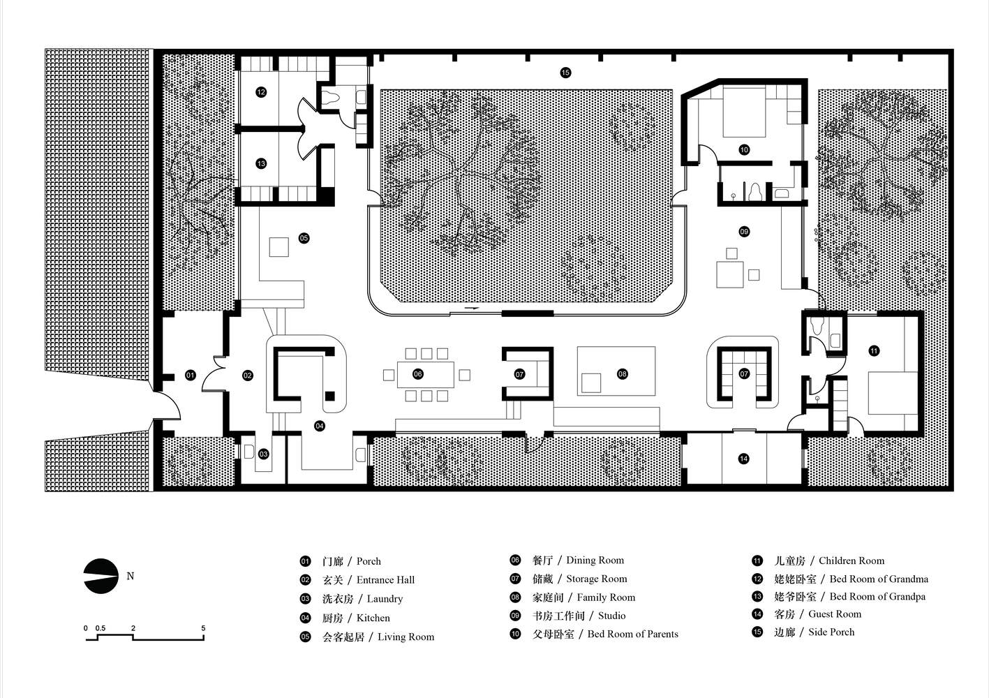 空间布局的创新与传统元素的融合:该项目在空间布局上展现了独特的创新。十字形的平面布局不仅赋予了建筑独特的视觉效果,更重要的是,它有效地划分了居住空间,创造了祖父母、父母、孩子和访客的私人空间,同时又通过细长的连接空间容纳各种公共功能。这种布局体现了多代同堂生活的节奏,在保持私密性的同时,也提供了交流互动所需的开放空间。设计师对传统乡村庭院住宅进行了改编和重新诠释,结合了现代生活的需求。这种对传统元素的尊重与创新,使得建筑既有文化底蕴,又充满现代感,体现了设计师对地域文化的深刻理解和对现代生活方式的精准把握。