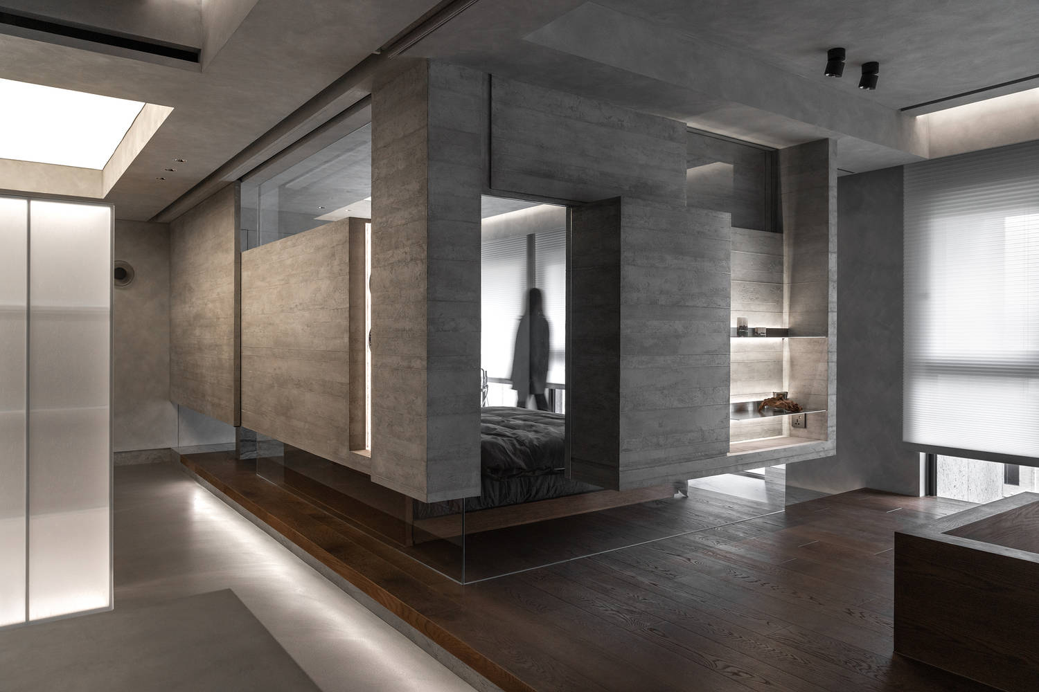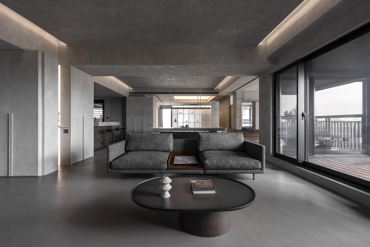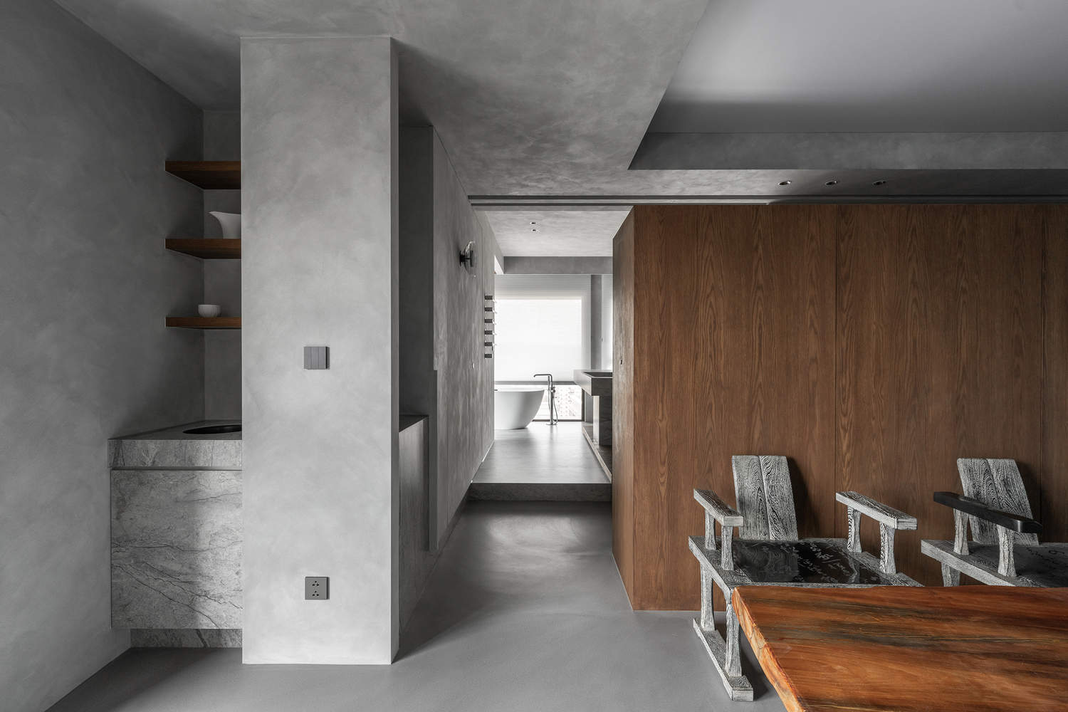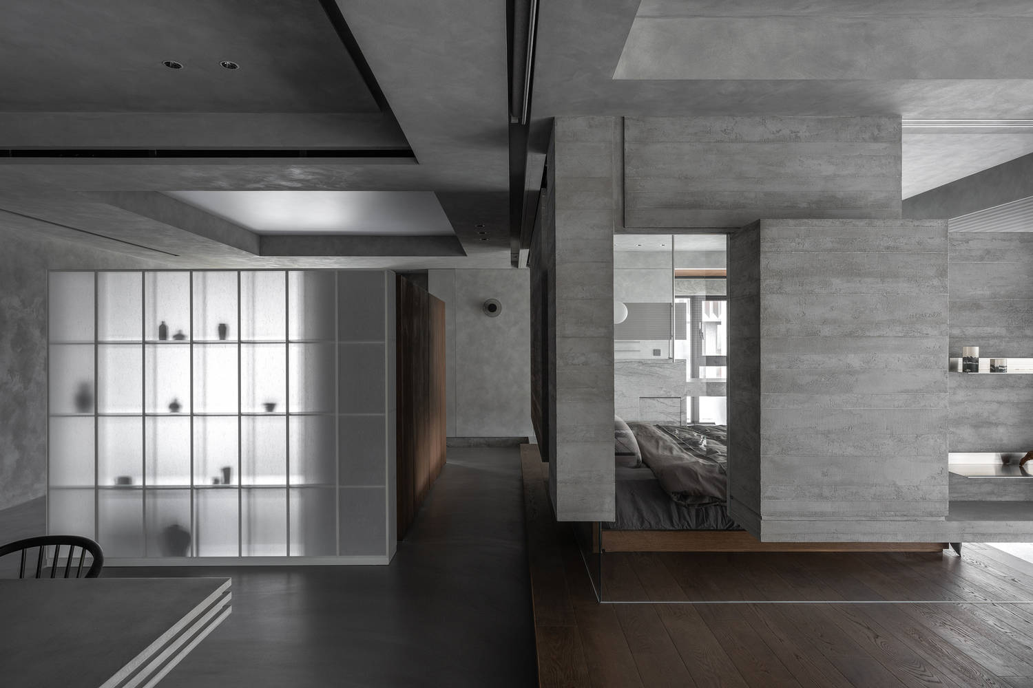The overall dark tone is accompanied by a low-profile, foggy texture. Wood, metal, glass, and light are incorporated, allowing the space to achieve a balance between tranquility and tension, showcasing a reserved but richly-layered atmosphere.