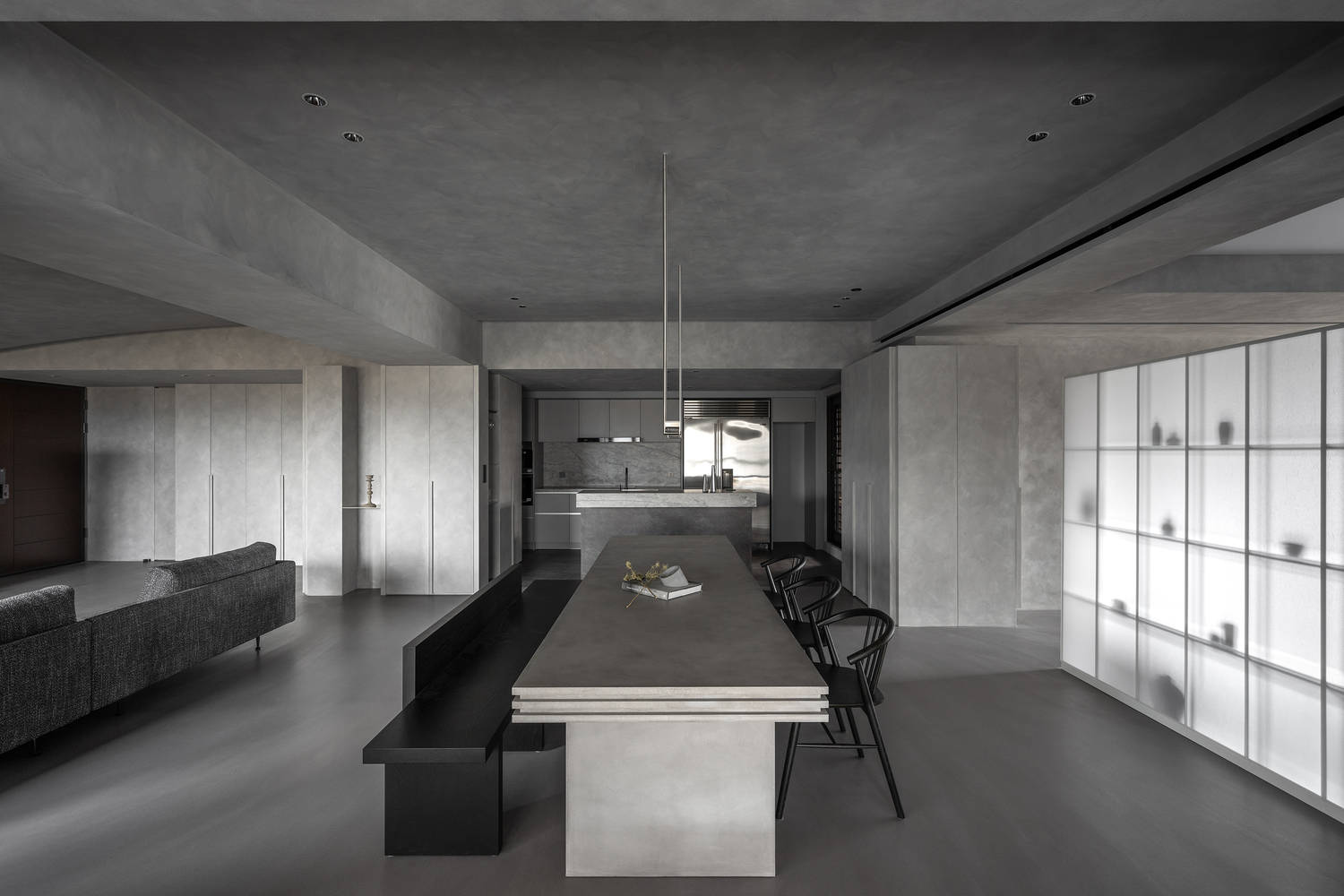 部分藏品被放置在光线勾勒出的背景墙上。半透明的屏幕和照亮的家具进一步创造了微妙的视觉层次,增添了诗意的感觉。在不同于传统实体墙隔墙的空间中,我们沿着墙壁扩展了存储功能,并定义了非全高橱柜的区域。通过一致的地板、天花板和间接照明,我们创造了一种视觉流动感,并强调了空间的延伸感。
