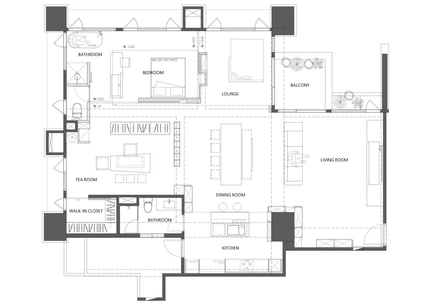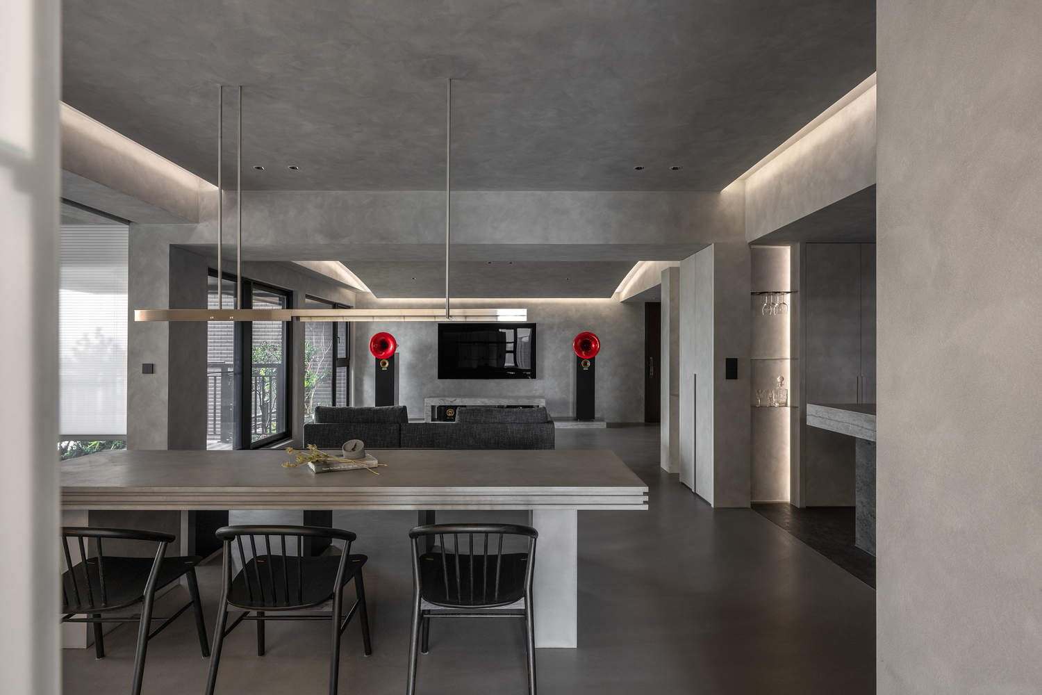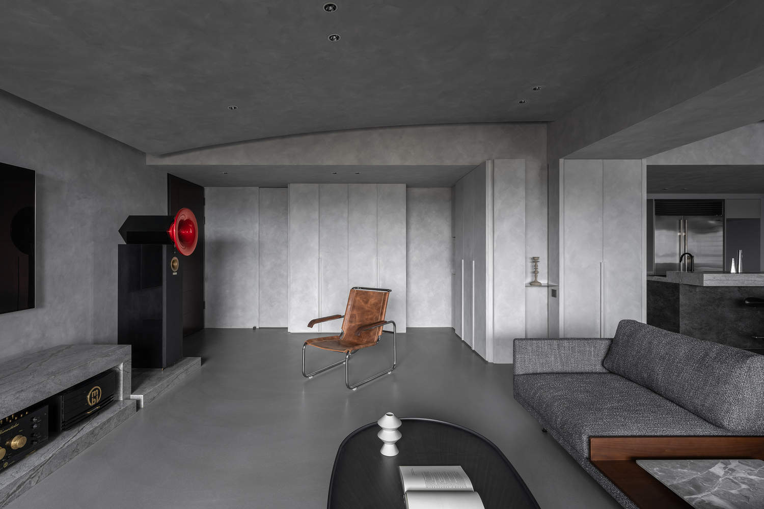 流动性与功能性的和谐统一:“石语住宅”在空间布局上展现了高度的流动性和功能性的和谐统一。设计师突破了传统实体墙的限制,将存储功能沿墙面延伸,并以非全高柜体定义不同的空间区域。这种设计手法既保证了空间的开阔性,又满足了收纳需求。一致的地板、天花板和间接照明设计,进一步强化了空间的视觉流动感和延伸感。平面图的呈现也清晰地展示了这种设计理念。这种既注重空间流动性,又兼顾功能性的设计,体现了设计师对空间规划和生活方式的深刻理解,创造了一个既舒适又充满艺术气息的居住环境。