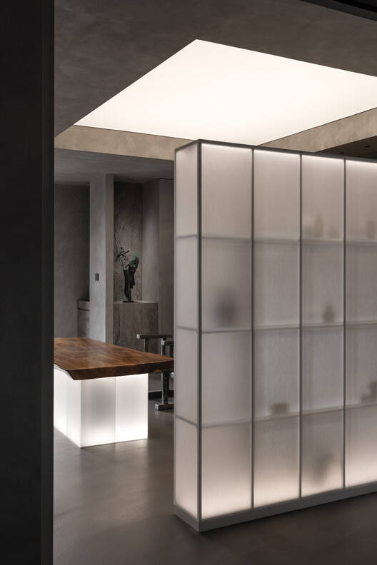 A part of the collections is placed on the backdrop wall outlined by light. The translucent screen and illuminated furniture further create subtle visual layers and add a poetic feeling. In a space different from traditional solid wall partitions, we extend the storage function along the wall and define areas with non-full-height cabinets. Through the consistent floor, ceiling, and indirect lighting, we create a sense of visual flow and emphasize a sense of extension in the space.