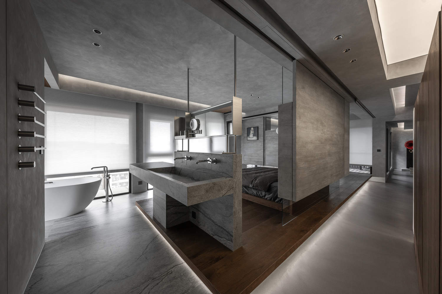 整体深色调伴随着低调、雾状的质感。木材、金属、玻璃和光线融为一体,使空间在宁静和紧张之间达到平衡,展现出一种内敛但层次丰富的氛围。