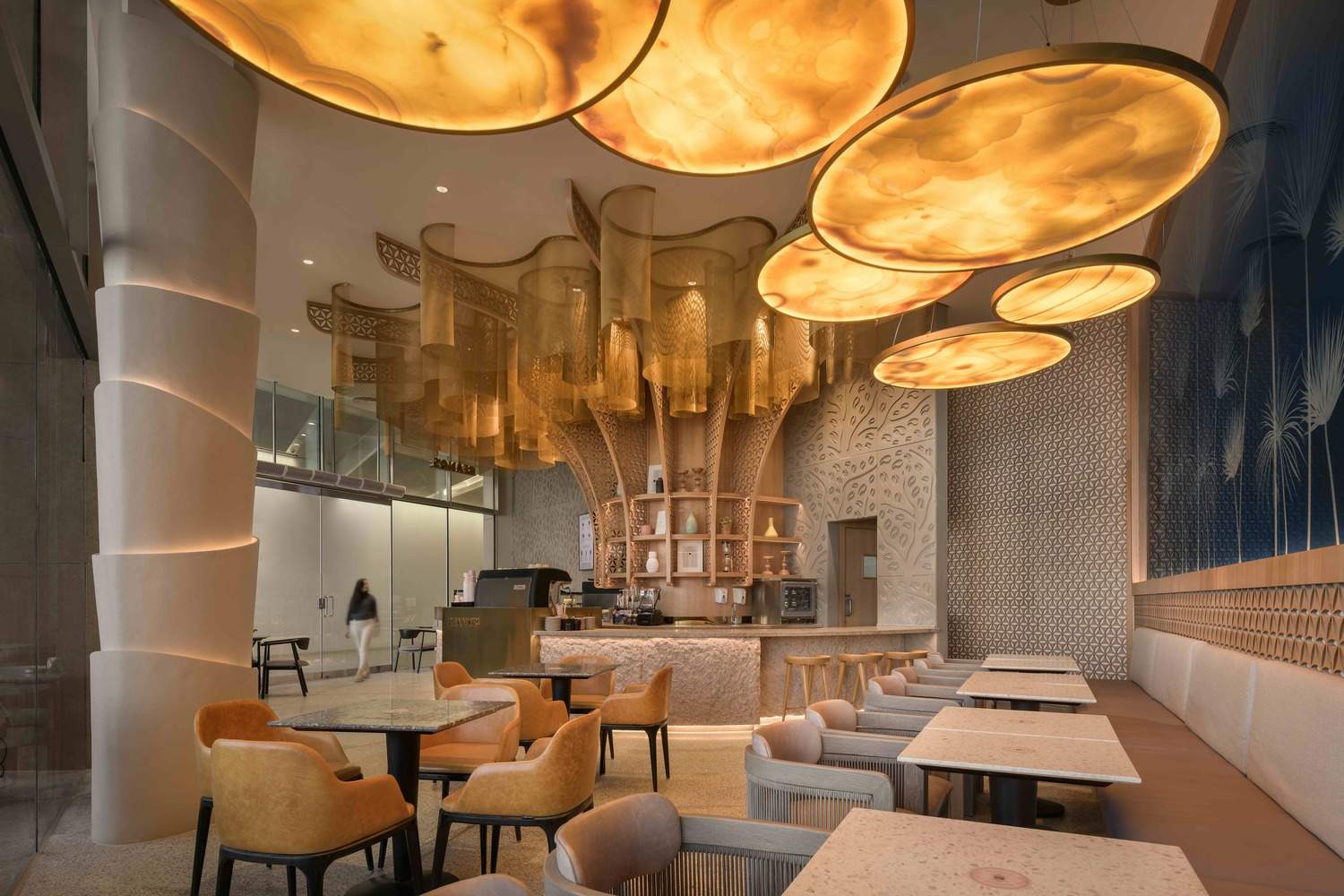 文化元素的巧妙融入: 项目成功地将埃及传统文化融入到现代设计中。铜树的设计灵感来源于埃及榕树,象征着愿望和希望,这使得空间具有了深厚的文化底蕴。这种文化元素的融入,不仅提升了项目的独特性,也为顾客带来了更丰富的体验。通过这种方式,设计师在空间中营造出了一种既熟悉又新颖的氛围,让顾客在享受咖啡的同时,也能感受到埃及文化的魅力。这种巧妙的文化融合,使得项目不仅仅是一个咖啡馆,更是一个文化体验的场所,体现了设计师对文化传承的责任感和对设计的创新精神。