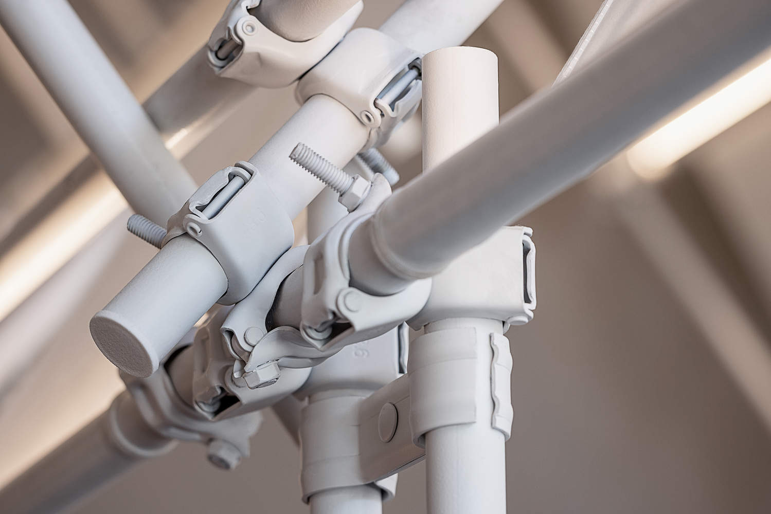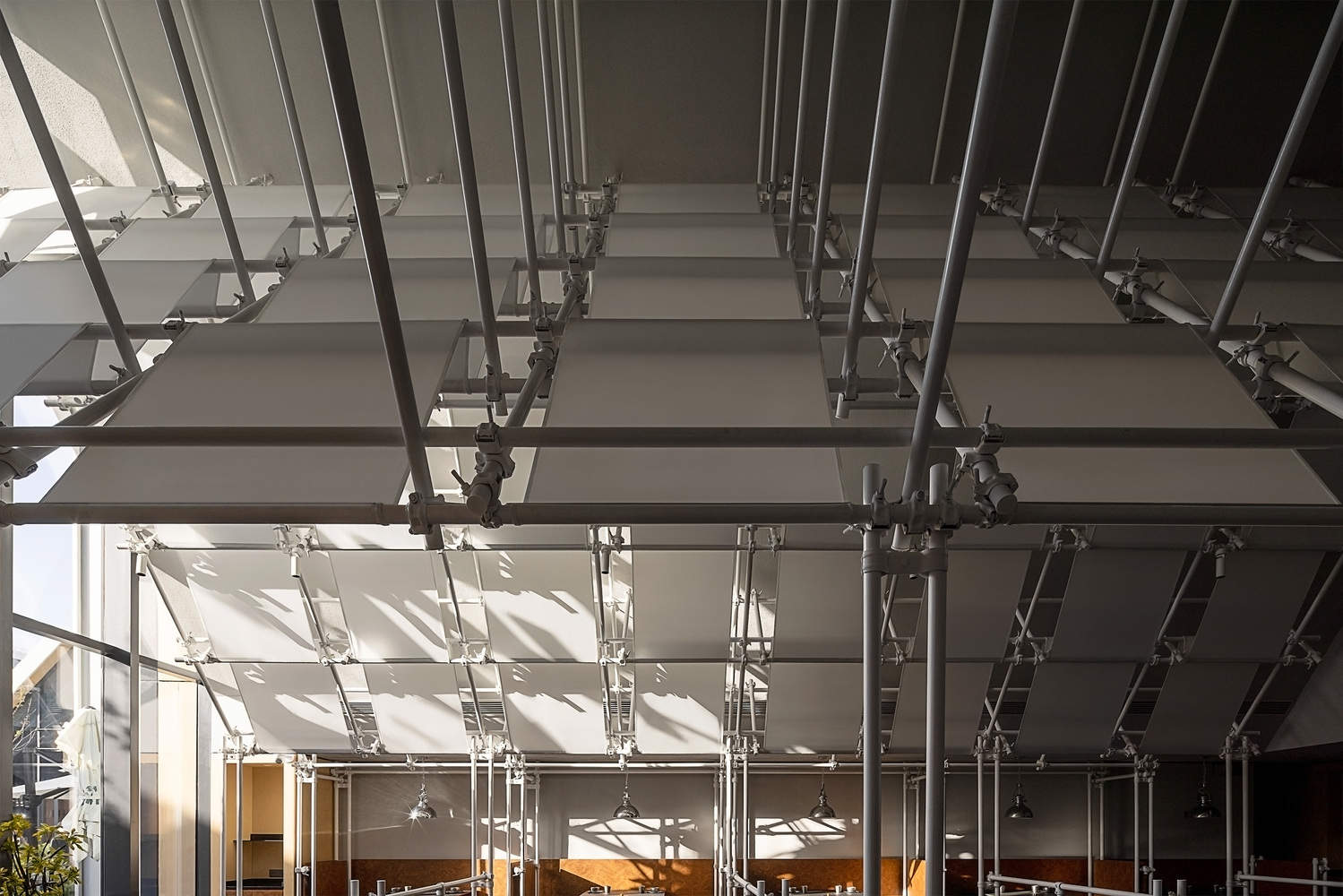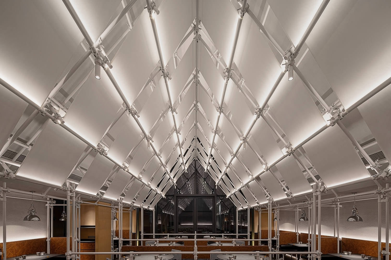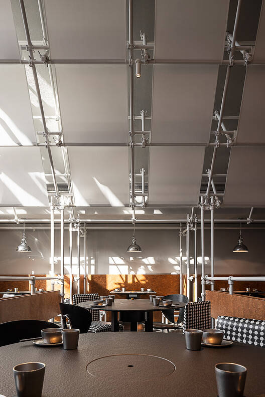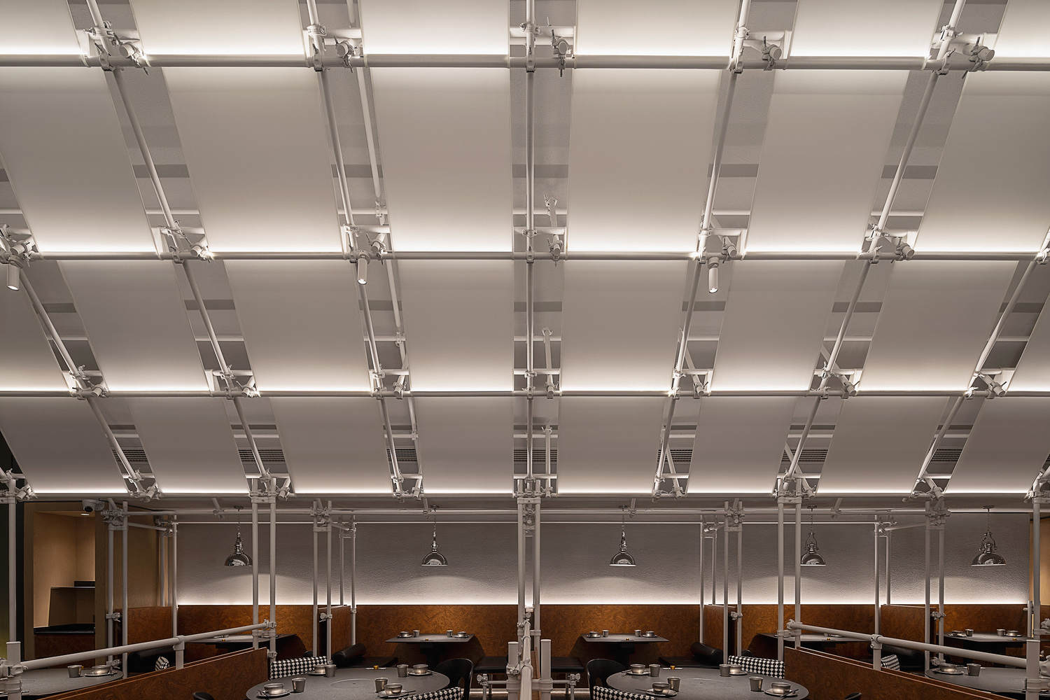 设计以脚手架为主要建构元素,搭配胶合木、树瘤纹木贴面和白色灯膜,营造出类似工棚与大排档的市井意象。灯膜并未贴临吊顶,而是缠绕于框架内侧,与吊顶保持一定距离,形成“屋中之屋”的效果。这一设计柔化了大厅尺度,营造出温馨包容的就餐氛围。透过灯膜侧面或间隙,食客可以欣赏到上方富有呼吸感的金属框架。