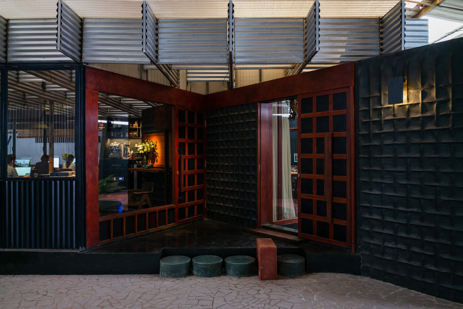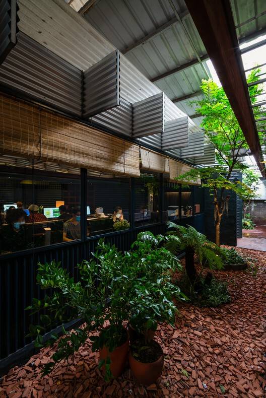 By creating gaps between the two roof systems, natural air circulation is achieved, effectively reducing the temperature inside the building, especially during the scorching noon heat. This buffer space is not only formed in the planar layout, but also exists in the cross-sectional design, allowing employees to visually interact with the surrounding green plants. Sunlight shines through the openings of the corrugated roof and is softened by the metal plates used as diffusers, reducing the glaring glare in tropical areas.