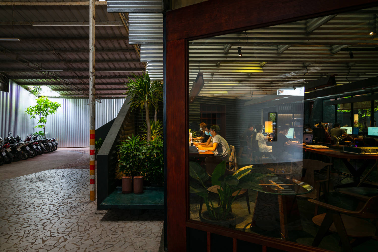 From the architect. The office of Tho. A Studio is a renovation project for a former shrimp farming facility built in 2015. After investigating the current situation, the design team found that the foundation and corrugated steel roof of the building are still structurally stable and do not need to be demolished. So they chose to preserve the original structure and "graft" a new building inside it to create a multifunctional workspace.