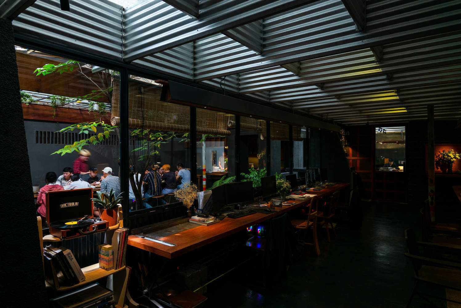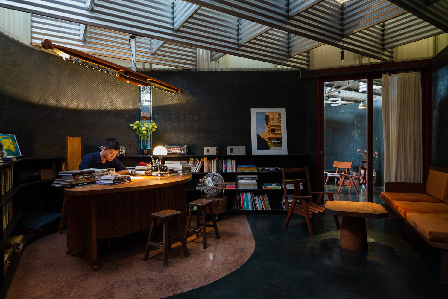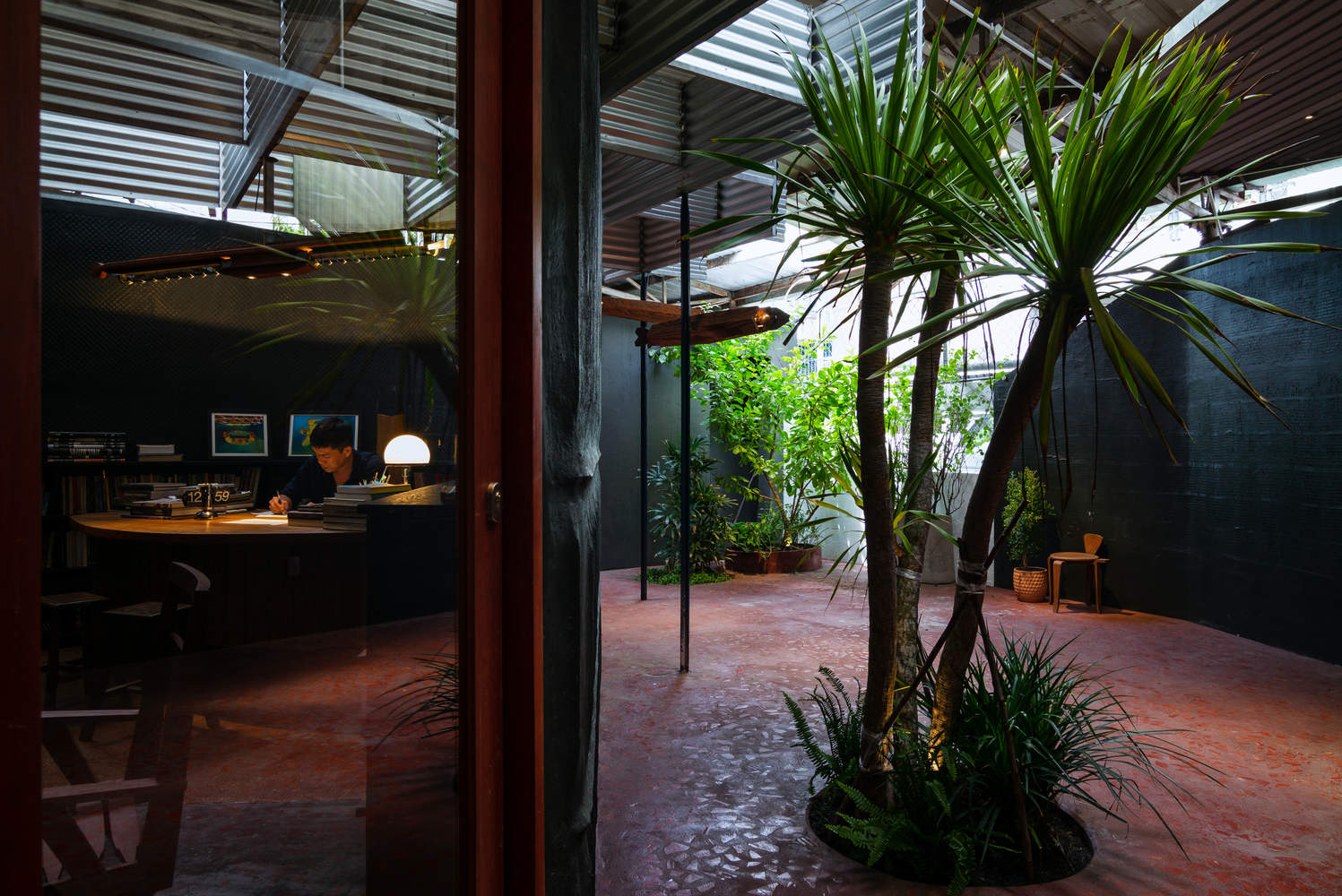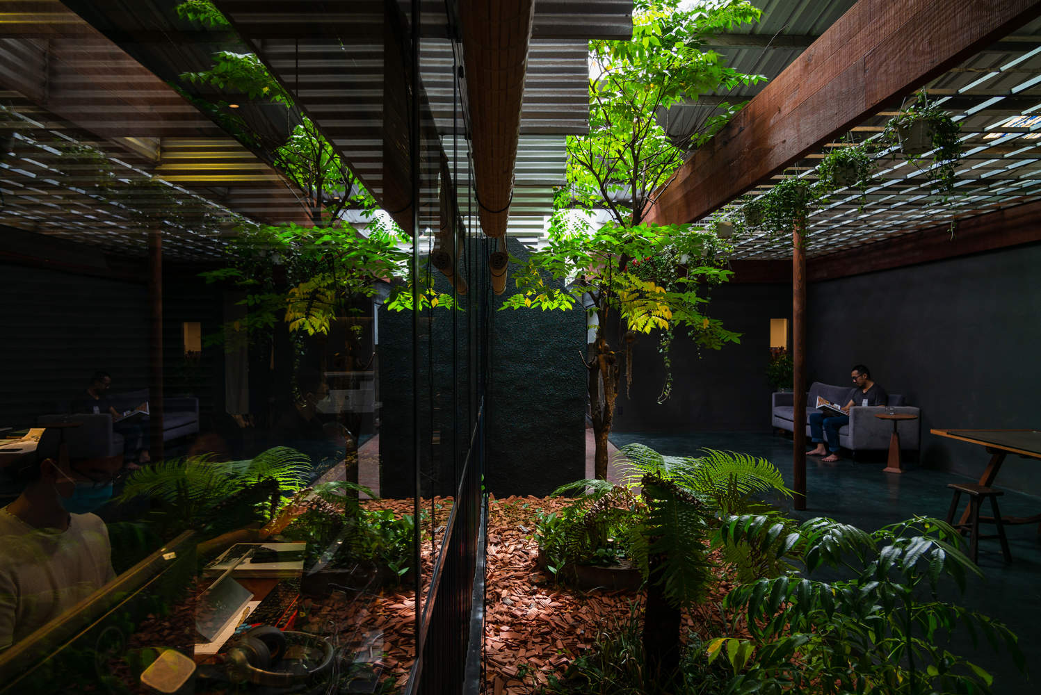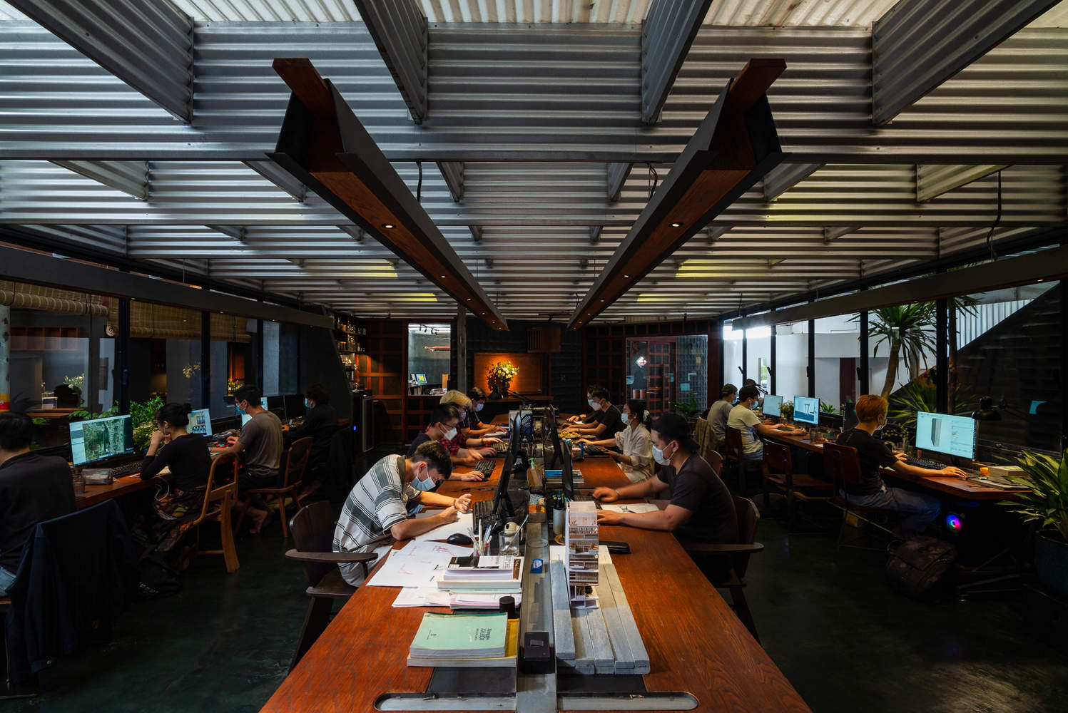 通过在两个屋顶系统之间创造间隙,实现了自然空气的流通,有效降低了建筑内部的温度,尤其是在正午酷热时分。这一缓冲空间不仅在平面布局上形成,在剖面设计上也同样存在,让员工能够从视觉上与周围的绿植产生互动。阳光透过波纹屋顶的开口洒下,经由作为漫射器的金属板柔化,减轻了热带地区刺眼的强光。