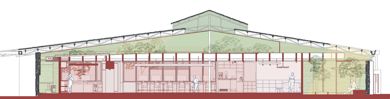 Trees have been introduced into the building, providing support for their growth by expanding the skylight area and fully opening the roof at critical locations. The project is surrounded by green plants, resembling an oasis hidden in an old garage, forming a transitional space that can be used for parking, sports, events, dining, and other purposes.