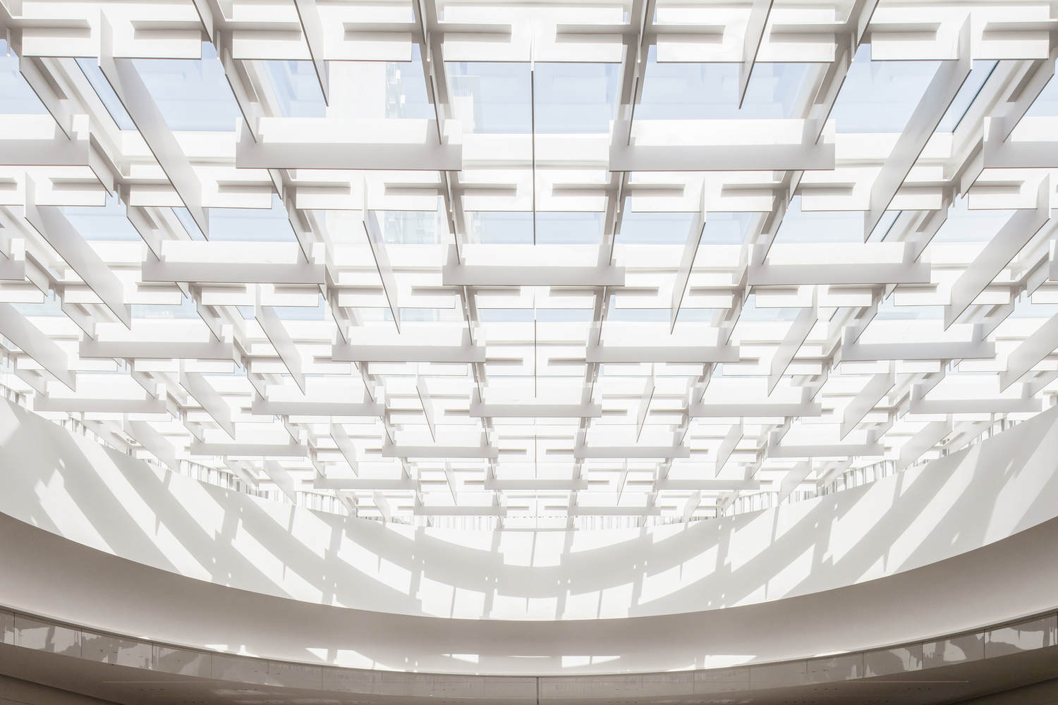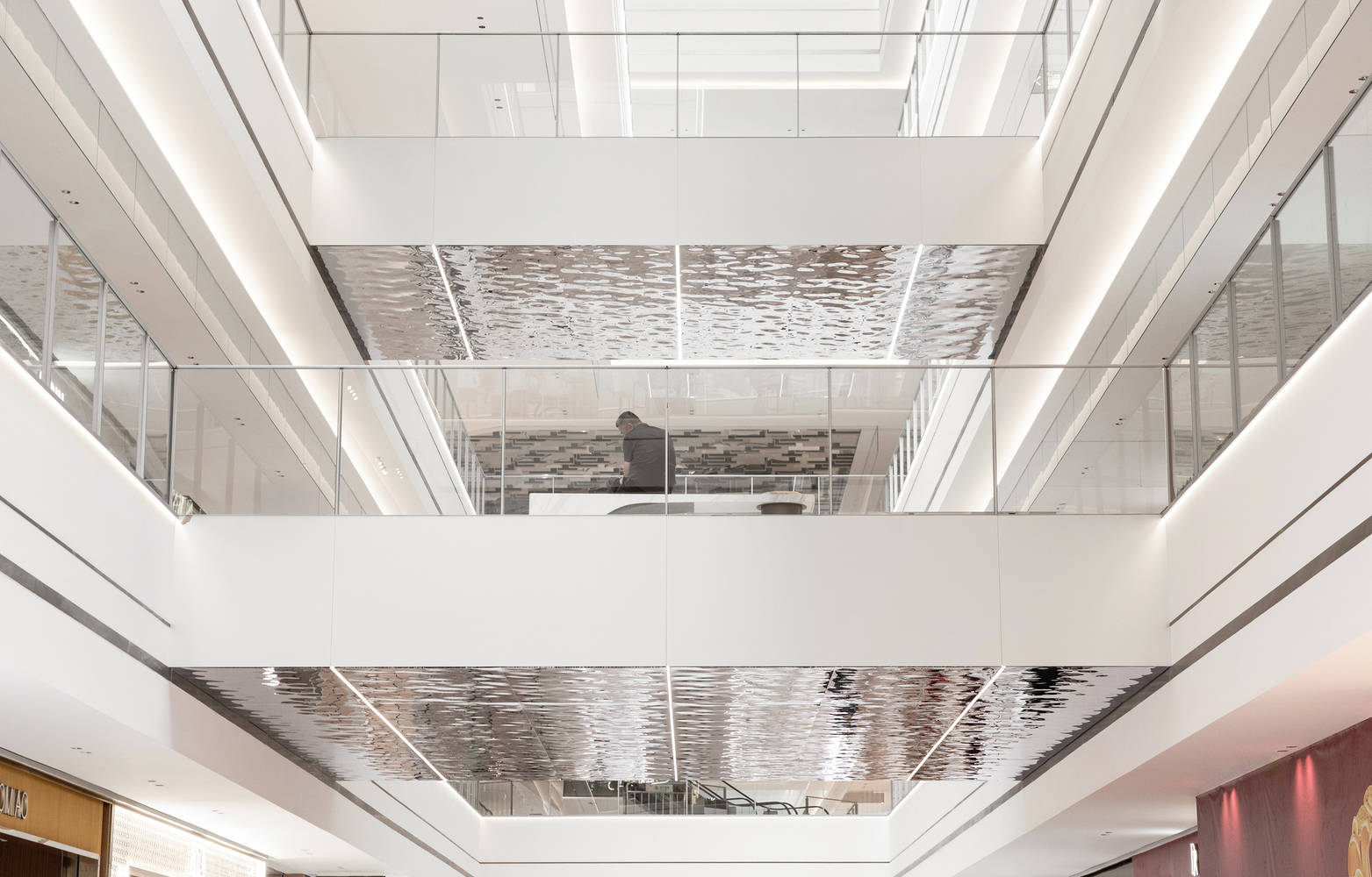 时空交错的岭南叙事,在地文化的立体重生。水的流动形态沁入顺德城市肌理,凝著成刚柔并济的岭南风韵。以解构者的视角,我们从庭院递进的层次、拱桥飞虹的曲线、渔舟的流线中萃取空间基因。"三进两院"的立体叠院体系,用钢构艺术编织,突破传统院落维度——清冷结构框架与柔润光影粒子交织,悬挑连桥化形为行驶之舟,玻璃幕墙倒映天光云影,在虚实之间重构《渔舟唱晚》的当代叙事。当现代美学对话水乡记忆,商业空间终成城市精神的容器。“棱镜引舟”:位于入口天花,半镜面与磨砂体块堆叠出扭曲时空的隧道,每一帧镜像宛如置身烟云萦绕的河舟上。
