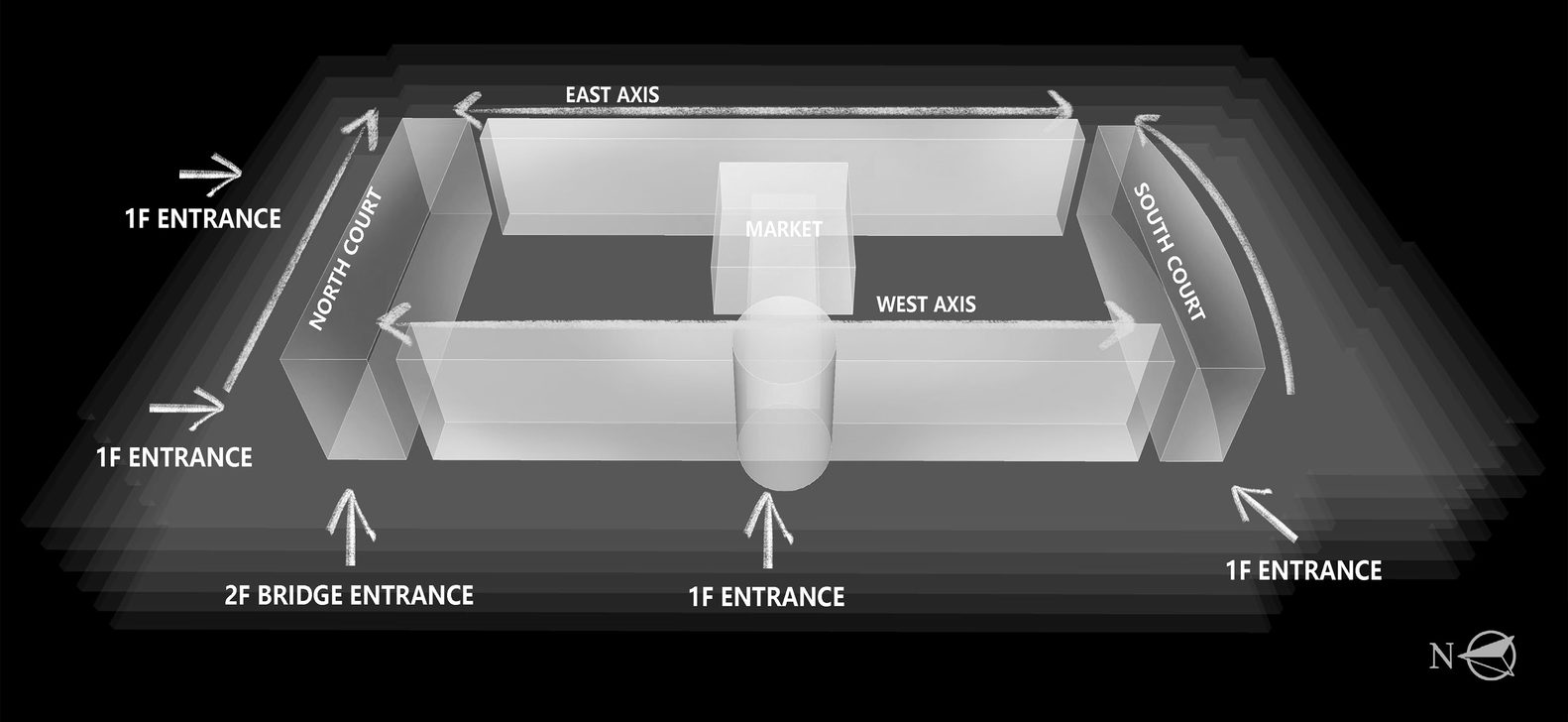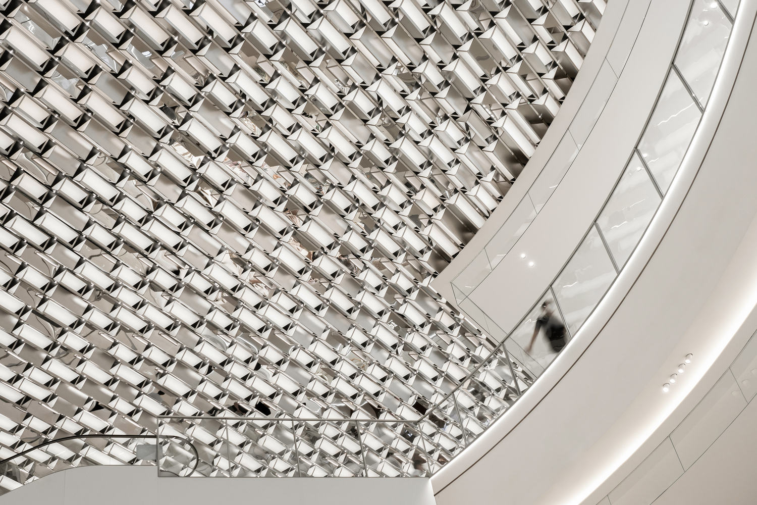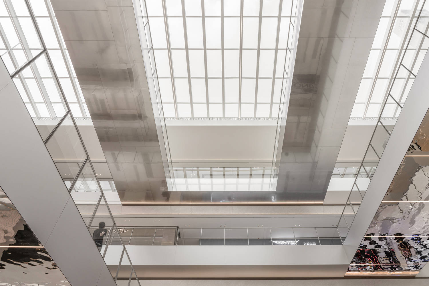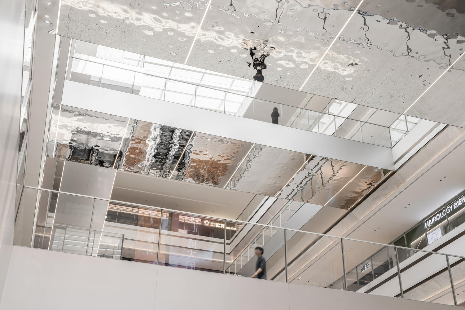 The Lingnan narrative of intertwining time and space, and the three-dimensional rebirth of local culture. The flowing form of water seeps into the urban texture of Shunde, embodying the Lingnan style of combining hardness and softness. From the perspective of deconstructionists, we extract spatial genes from the progressive levels of courtyards, the curves of arched bridges and flying rainbows, and the streamlines of fishing boats. The three-dimensional stacked courtyard system of "three entrances and two courtyards" is woven with steel structure art, breaking through the traditional courtyard dimension - the cold structural framework and the interweaving of soft light and shadow particles. The suspended bridge is transformed into a moving boat, and the glass curtain wall reflects the sky and clouds, reconstructing the contemporary narrative of "Fishing Boat Singing at Night" between reality and virtuality. When modern aesthetics converse with memories of water towns, commercial spaces ultimately become containers of urban spirit. Prism guided boat ": located on the entrance ceiling, a tunnel of twisted space-time is created by stacking semi mirror and frosted blocks, with each frame of reflection resembling being on a river boat shrouded in smoke and clouds.