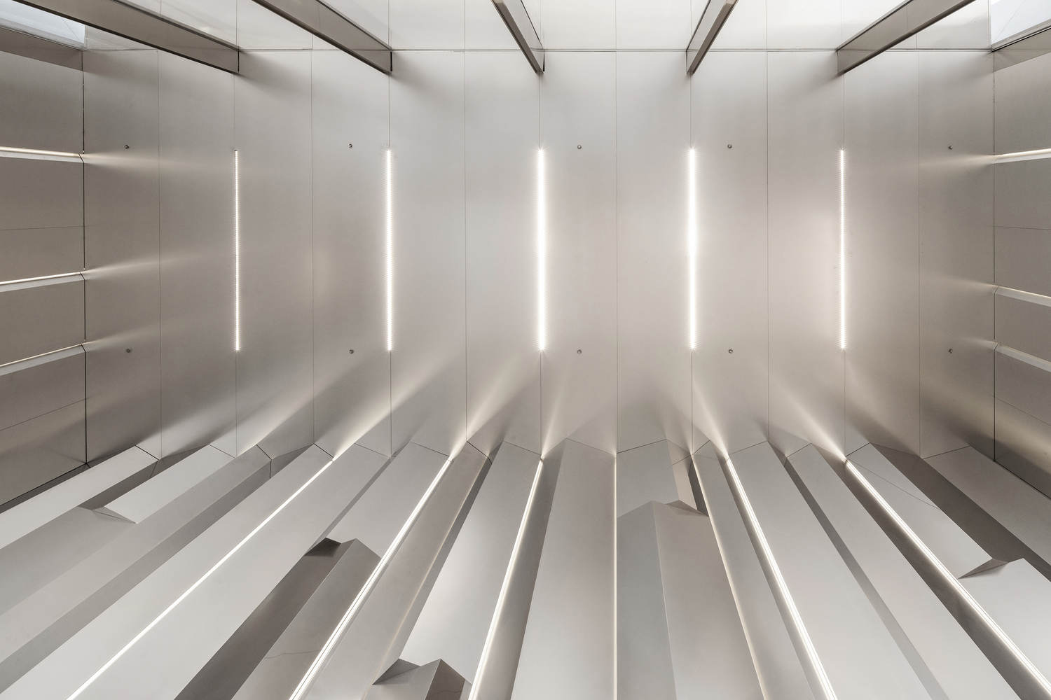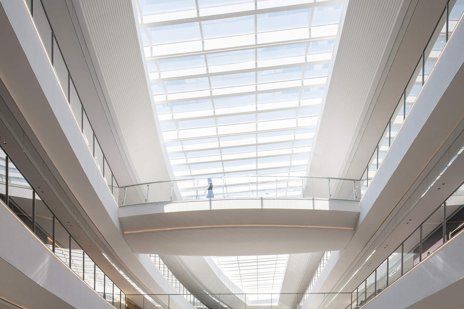 空间意象与光影艺术:项目的精髓在于对光影的巧妙运用和对水乡意象的极致表达。通过对光线的控制,营造出“扑朔迷离、真幻共生”的视觉效果,将商业空间转化为充满诗意的场所。特别是“棱镜引舟”的入口设计,利用半镜面和磨砂体块,打造出扭曲时空的隧道,营造出烟云缭绕的梦幻氛围。悬浮舟型连桥、空中月门的设计,以及檐口光轨、天窗格栅对阳光的解构,都体现了设计者对光影艺术的深刻理解和精湛运用。这些细节共同构筑了沉浸式的体验,让消费者在购物的同时,也能感受到文化与艺术的熏陶。
