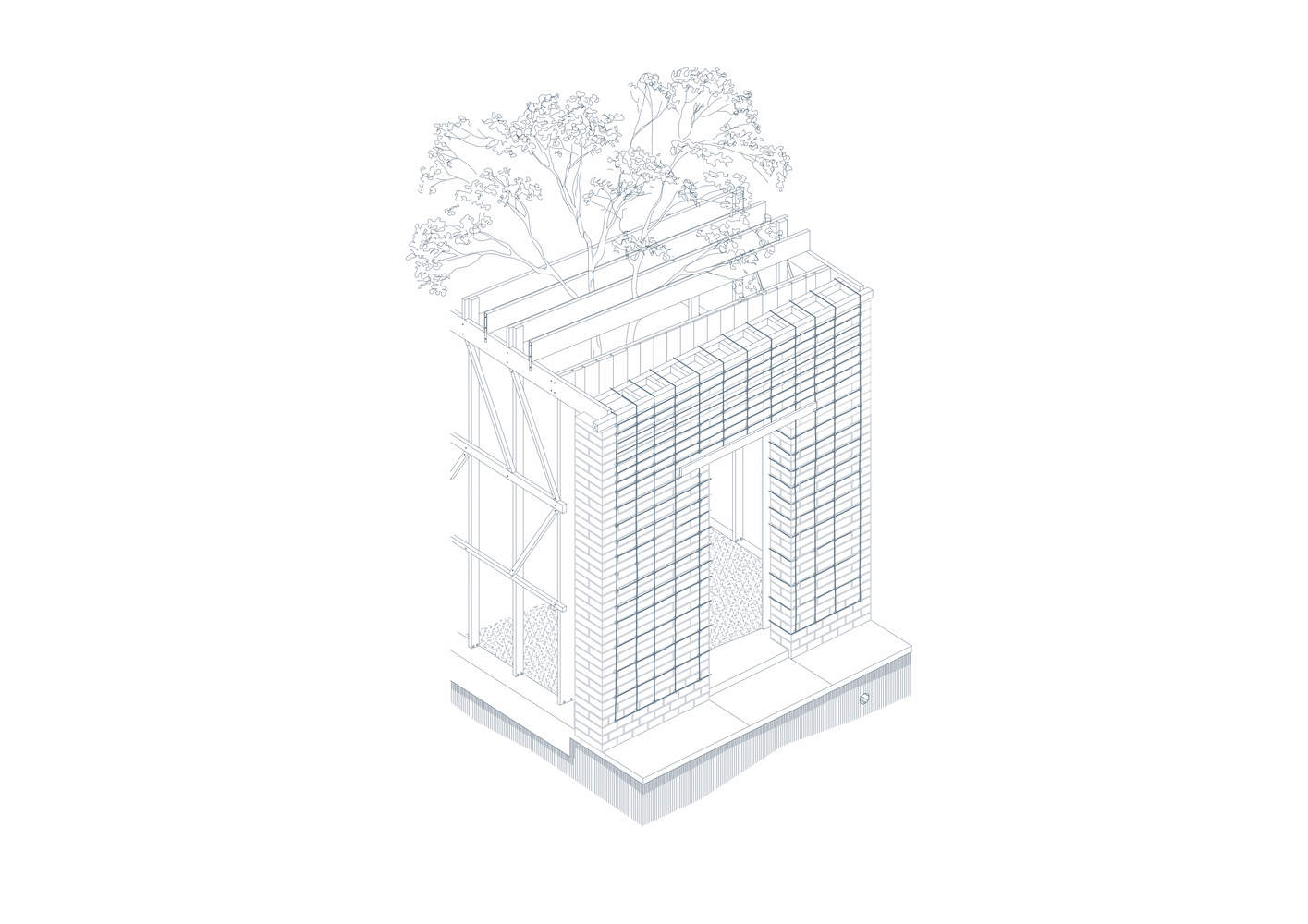 在一块宽 4 米、深 21 米的地块上,拟采用胡亚鲁罗木(学名:Ormosia Coccinea)建造一座结构体,其净高 4 米,截面连续统一。这种木材独有的 2 英寸(约 5.08 厘米)厚度,使得该建筑在建造过程中得以灵活施工、反复调整并积累实践经验。