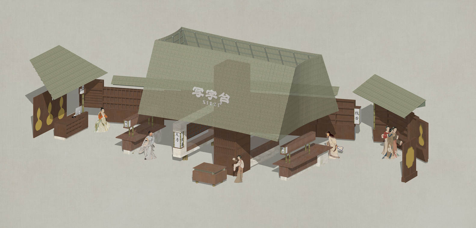 And we have specially designed a series of "palace lanterns" for the entire store's navigation system. They are either embedded in walls, mounted on frames, or suspended between columns. High and low, varying in size, embellish a lively literary market. Guide customers to find what they want to buy as quickly as possible. In terms of material selection, we mainly use green as the main color tone. The green ink patterned gilded board serves as the main material for the top and eaves. The ground is made of green terrazzo blocks. And the wall is made of soft stone that imitates cave stones. The cabinet is made of cherry wood grain board, glass, acrylic light box, and bamboo.