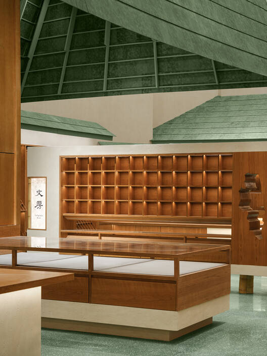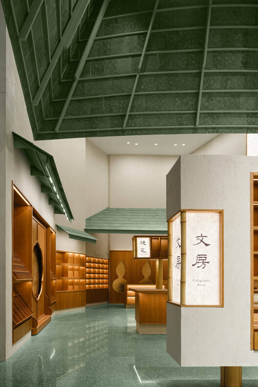 而整个店铺的导视系统我们专门设计了一些列的“宫灯”造型。他们或嵌入墙体,或至于架上,或悬与柱间。高高低低,大小不一,点缀出一个热闹的文房市集。引导让顾客能以最快的速度找到他想买的东西。在材料的选择上,我们以绿色为主色调。绿色水墨纹样的鎏金板作为顶部,檐口的主材料。地面选用了绿色水磨石块材。而墙面则是选择仿洞石的软性石材。柜体是樱桃木纹板材,玻璃,亚克力灯箱,竹子。
