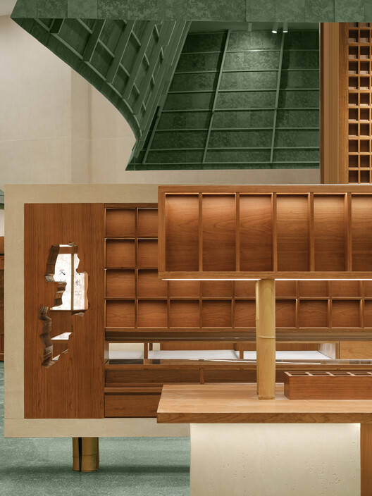 材料运用与细节处理:在材料的选择上,该项目着重体现了对绿色和传统文化的尊重。绿色水墨纹样的鎏金板、绿色水磨石地面、仿洞石的软性石材以及樱桃木纹板材等,共同营造出一种和谐统一的视觉效果。特别值得一提的是,项目精心设计的“宫灯”导视系统,巧妙地穿梭于整个空间,为顾客提供了清晰的导向,同时也在视觉上增添了一抹亮色,丰富了空间的层次感。这些细节的处理,体现了设计师对整体风格的精准把握和对传统文化精髓的深刻理解。