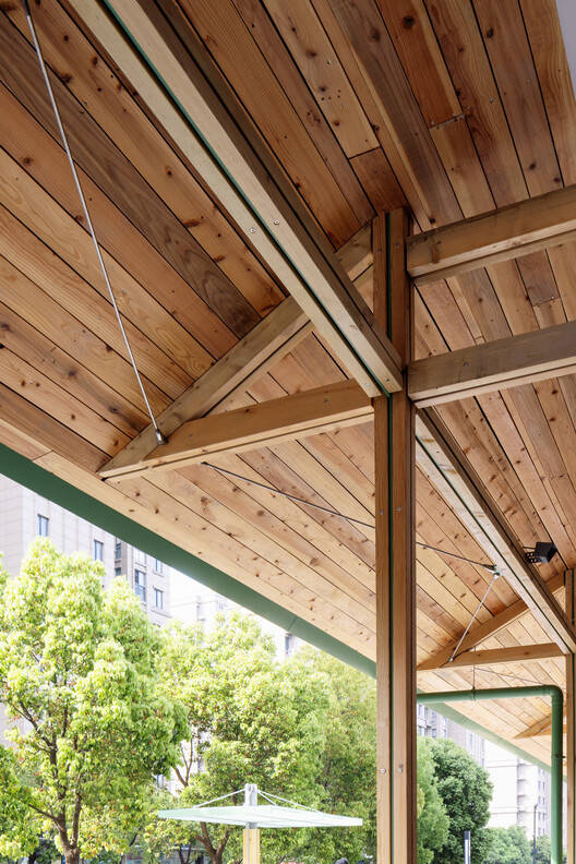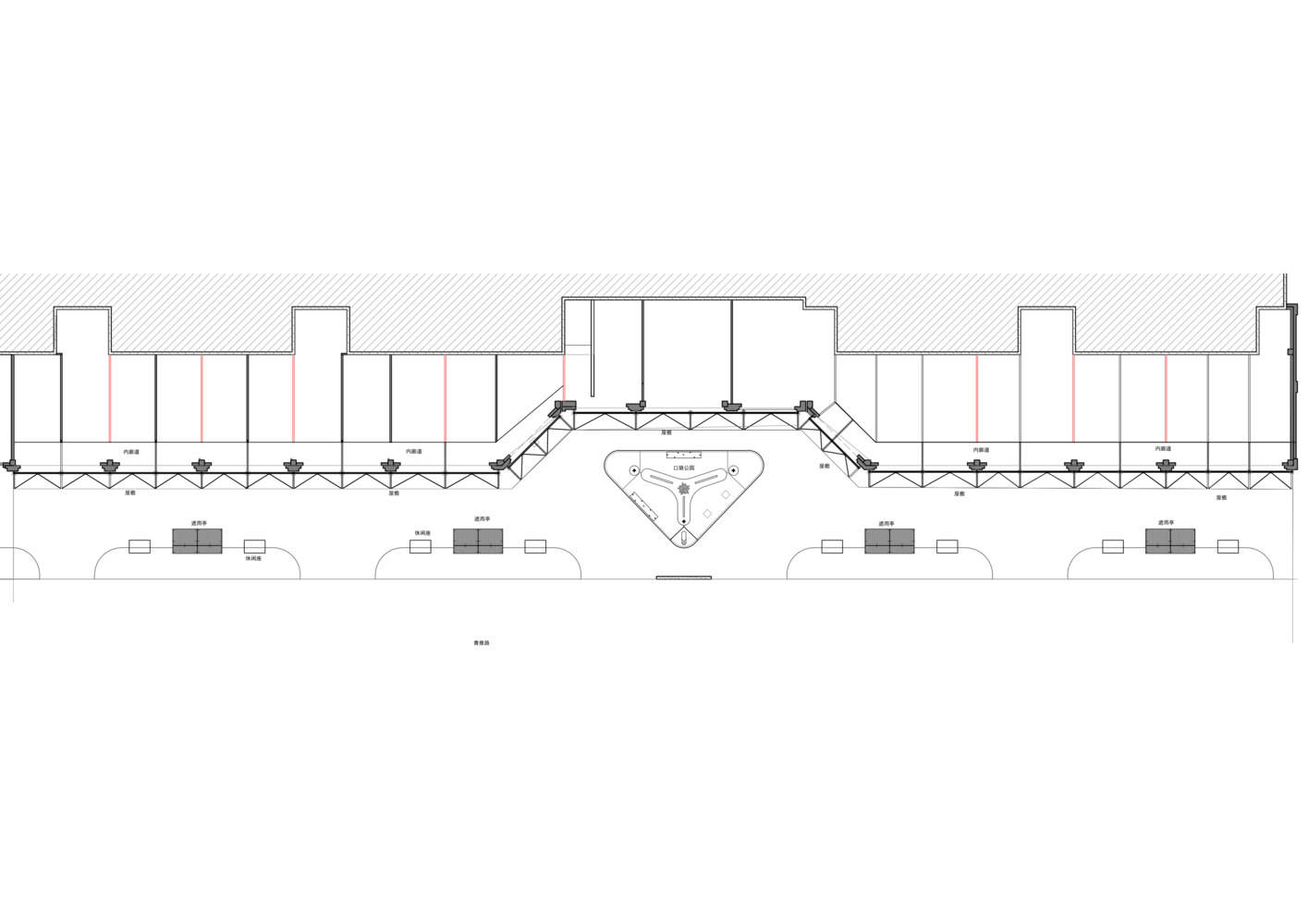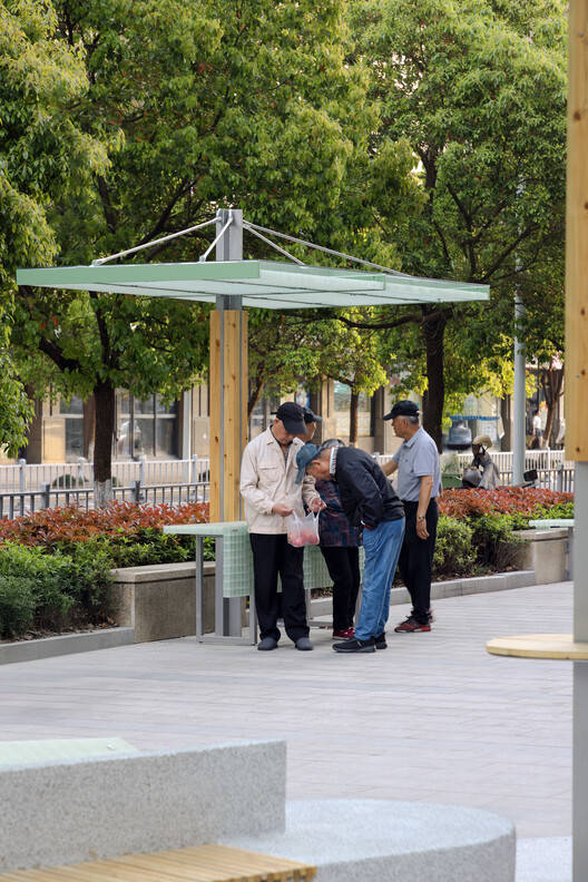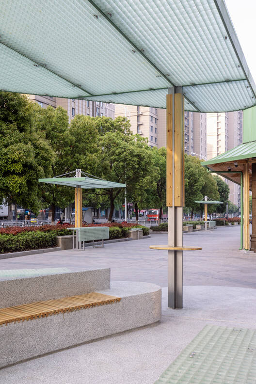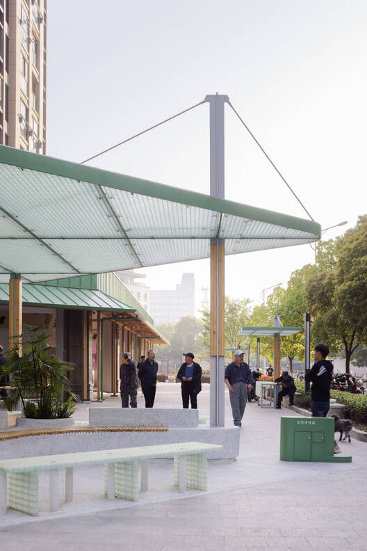The rain pavilion uses a combination of fiberglass grille and laminated glass. When light falls, the same grille is softened to avoid direct sunlight.. At the same time, when the user looks up, it can weaken the cluttered high-rise environment around them, creating a comfortable visual experience. The use of cross shaped steel structure and tie rods in the structure makes the entire structure look more lightweight. The seats are mainly made of washed stone and wood, resembling the shape of a "dart". The retreat at the boundary of the active line and the "blank space" between the shops weakened the sense of oppression between the buildings. At the same time, considering the high frequency of use by the elderly in their daily lives, their psychological security in the resting area will be greatly enhanced.