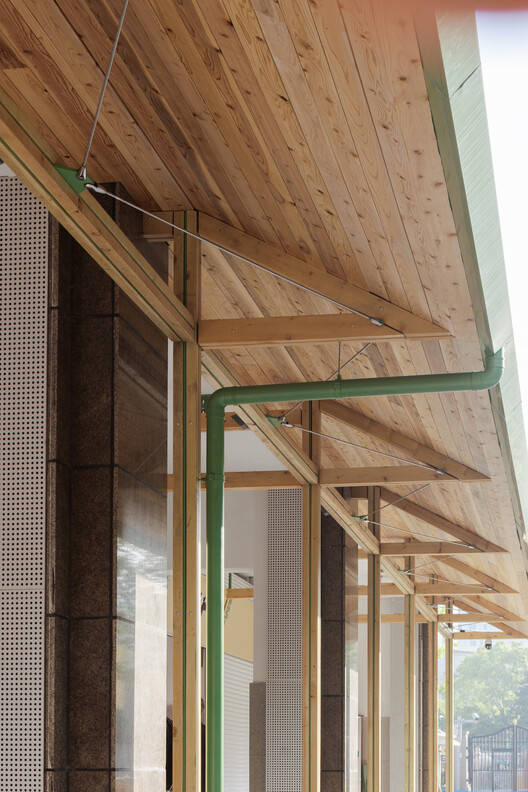 The entire project actually has 770 square meters for commercial leasing, while the other 1000 square meters are public open spaces.. The project is divided into two phases, with only 25 days from the confirmation of the plan to the completion of the first phase. 70% of the components are pre processed in the factory, and 30% are constructed on-site. In the first phase, we made an eave and made concessions to the commercial space of the original podium building. The 100 meter podium building was moved 1.5 meters inward from the shops, and the eaves were cantilevered 1.5 meters, forming a 3-meter-wide semi outdoor space. This space not only provides shelter from wind and rain, but also connects with the internal shops, forming a new micro social scene. The second phase is to make "minor modifications" to the existing landscape, adding outdoor rain pavilions and small table boards on stone benches, with minimal changes to improve comfort and experience, and adding more usage scenarios.