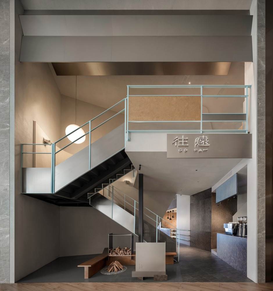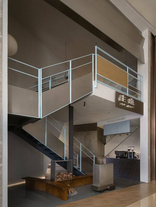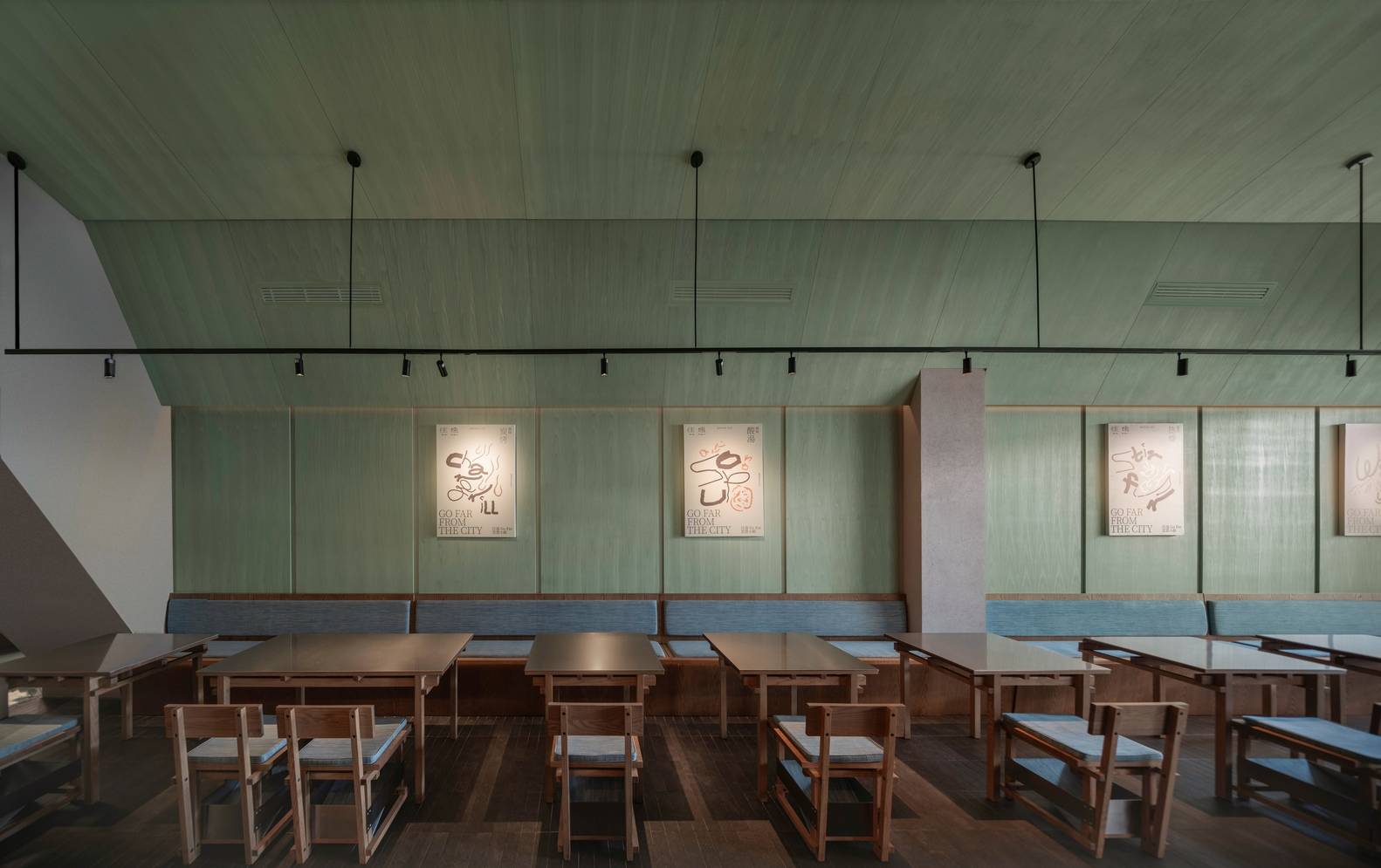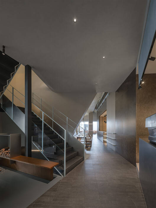 Indoor, green wooden boards are used to simulate vine winding, running through the first and second floors, responding to the imagination of "wild vine growth in the shade of mountain streams". The narrow space is like a stone valley, with overlapping wooden boards echoing the metal facade, creating a continuous, moist, and naturally memorable spatial texture. On the second floor, a "stone room" private room is set up, with sliding railings as the boundary, resembling ancient people holding banquets in the mountains.