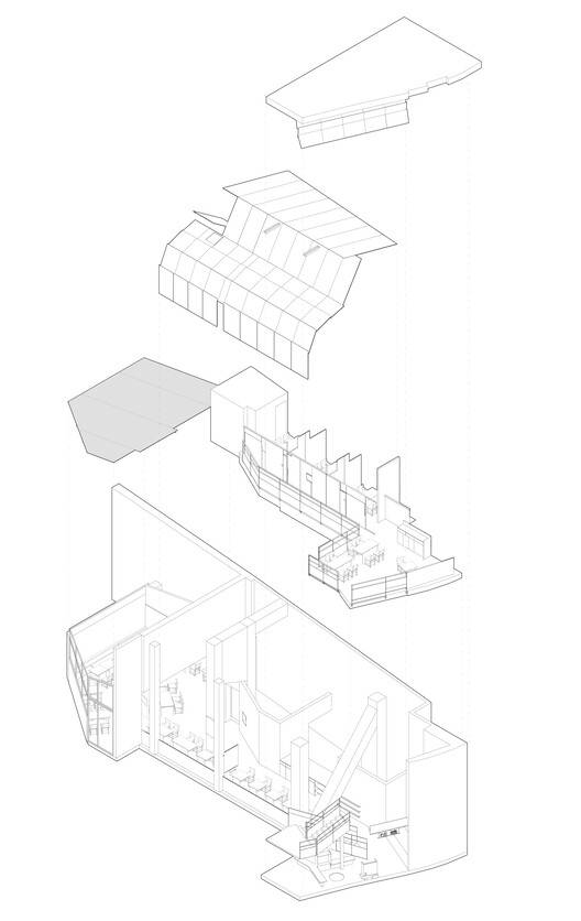 The site itself is narrow and has a height of nearly 12 meters. We took advantage of this verticality to create a metal folding plate "roof" inspired by the roofs and terraces of Qiandongnan. Its suspended structure creates a strong visual memory and also possesses the necessary indicative qualities in urban environments.