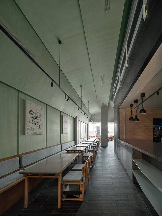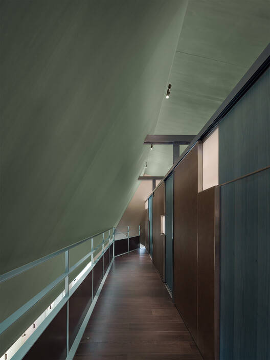 空间设计与材料运用的创新性: 项目在狭长的空间内,巧妙地利用了垂直空间,打造出令人印象深刻的金属折板“屋盖”。这种设计不仅具有强烈的视觉冲击力,也赋予了建筑在城市环境中的辨识度。室内设计同样精彩,青绿色木板模拟藤蔓缠绕,贯穿两层空间,营造出一种连续、湿润、自然的氛围。设计师对黔东南地区材料和符号的运用也非常巧妙,靛蓝染布、定制屏风等细节,都体现了设计师对地域文化的尊重和创新。这种对材料的巧妙运用,以及对文化元素的深度挖掘,使得空间更具层次感和故事性。