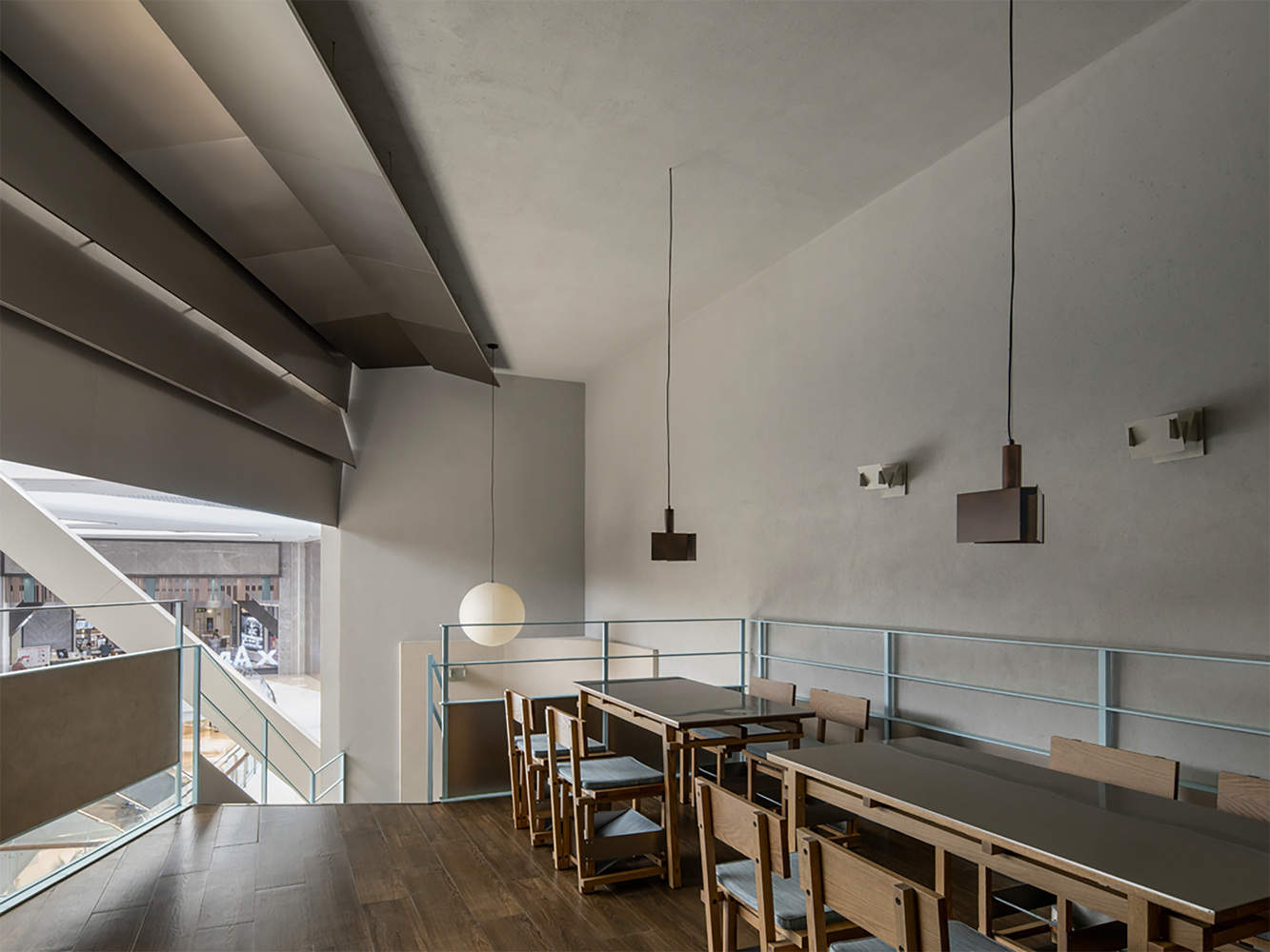 场地本身狭长且层高近 12 米,我们利用这一垂直性优势,将外立面打造为一个灵感来自黔东南屋顶与梯田的金属折板“屋盖”。其结构悬浮感营造出强烈的视觉记忆,也具备了城市环境中必要的招示性。
