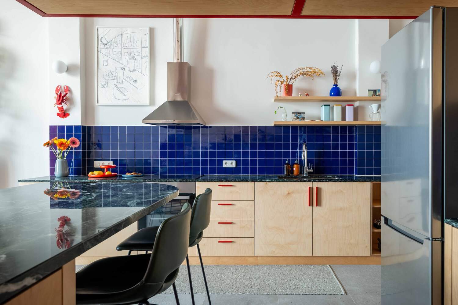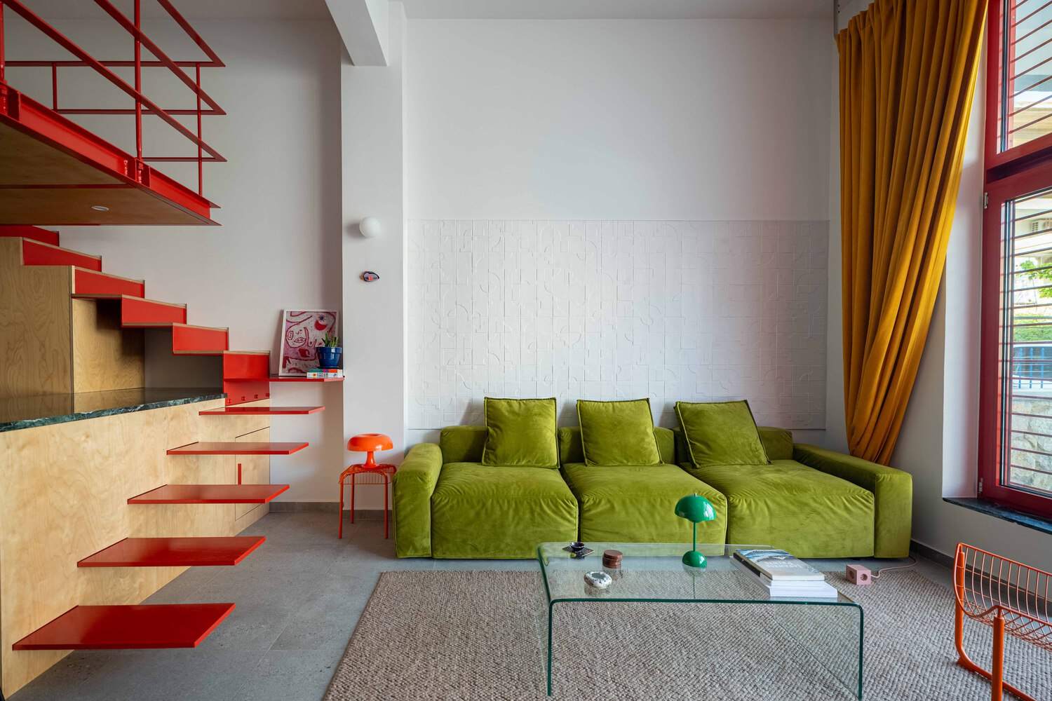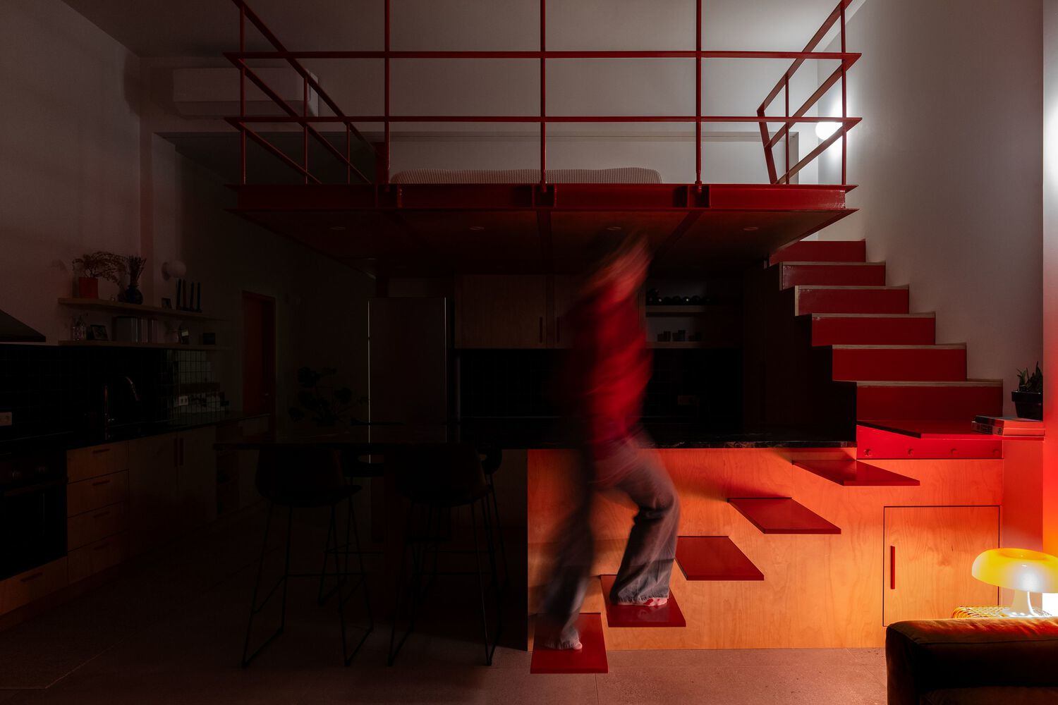 阁楼,作为一件建筑家具,被设想为设计的关键特征,它集成了多种服务,包括厨房、用餐区、休闲区和储物区。 为了纪念它的首次使用,新的空间由红色钢结构与不锈钢定制家具组成。 蒂诺斯绿色大理石、厚实的纺织品、大胆的彩色瓷砖和未经加工的桦木胶合板被用来加强公寓的现代感。