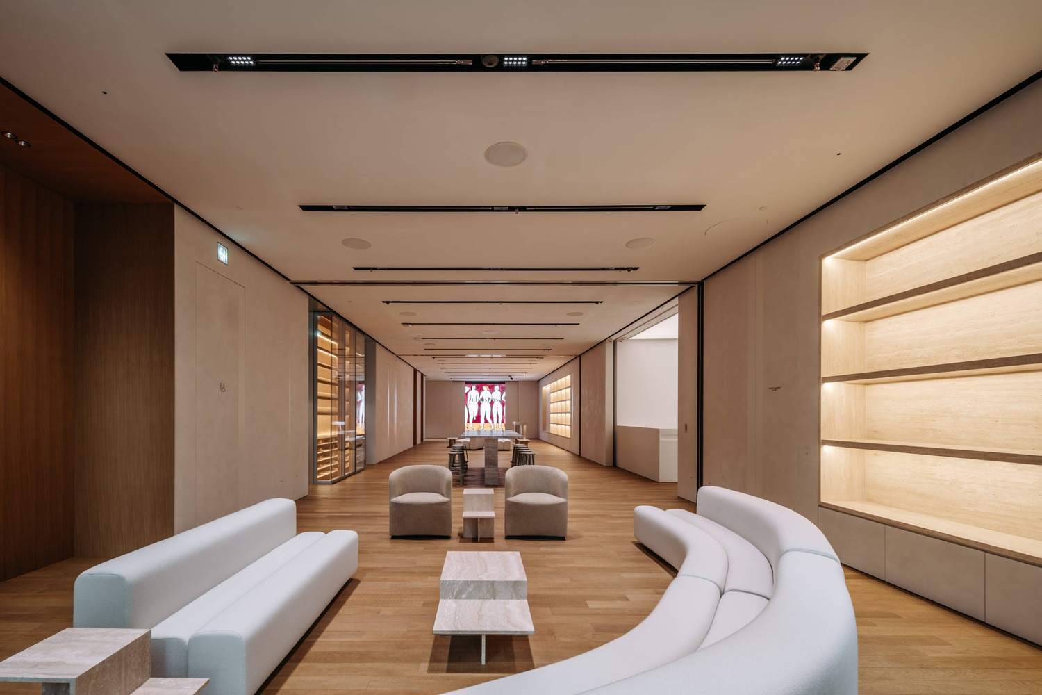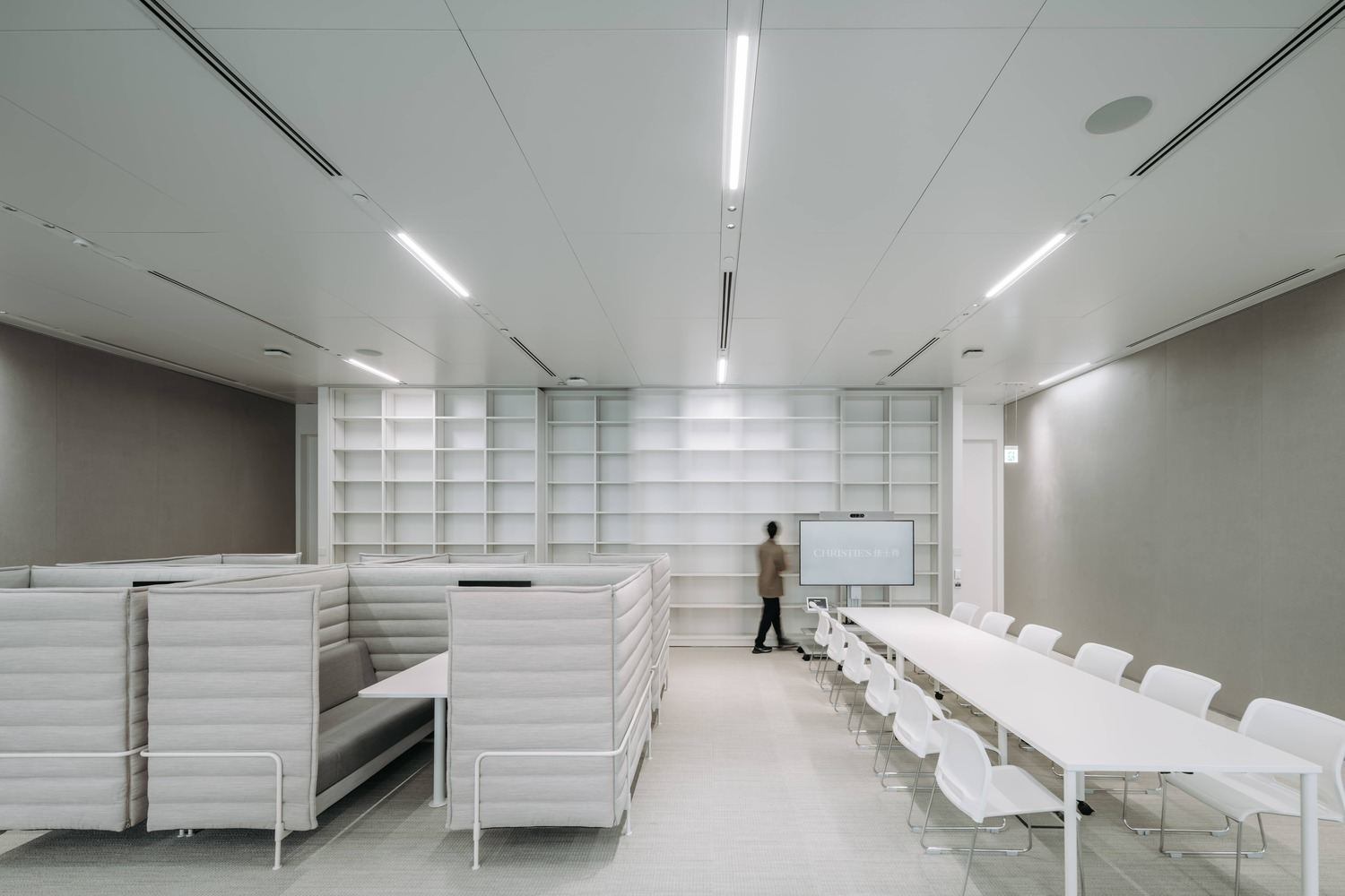 灵活多变的展览空间与技术创新:该项目最引人注目的亮点在于其展览空间的灵活性和适应性。设计团队巧妙地运用大型电动墙体和可移动的隔断系统,使得展厅可以根据不同展览的需求,在开放、分隔、以及直播拍卖厅之间自由切换。这种设计极大地提高了空间的利用效率,并显著降低了展览更新的时间成本。此外,配备的多功能影音系统,包括大型屏幕、摄像头和灯光设备,进一步增强了空间的适应能力,确保了佳士得全年活动的顺利进行。这种空间设计策略体现了对佳士得业务模式的深刻理解,为艺术品展示和拍卖提供了极大的便利。