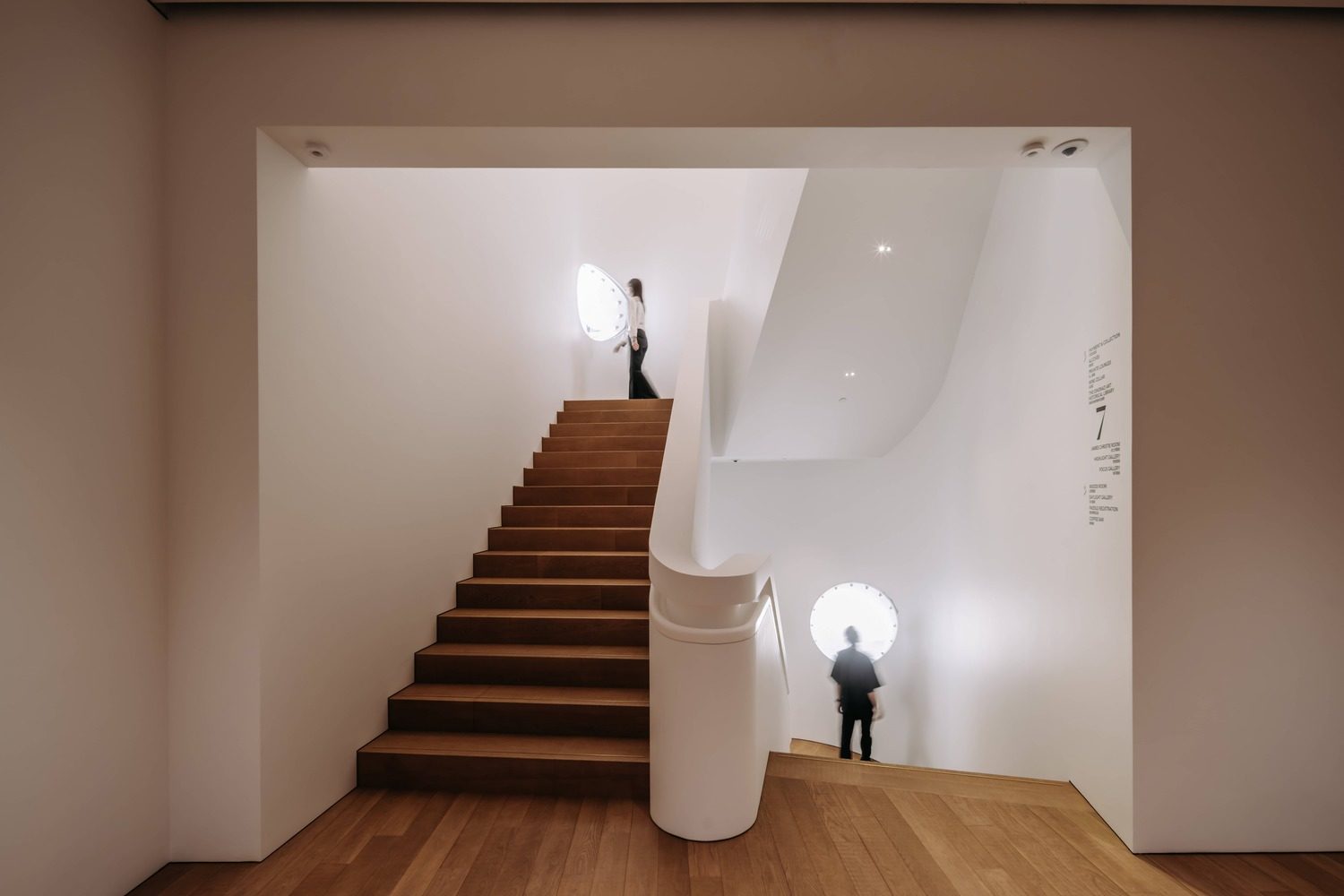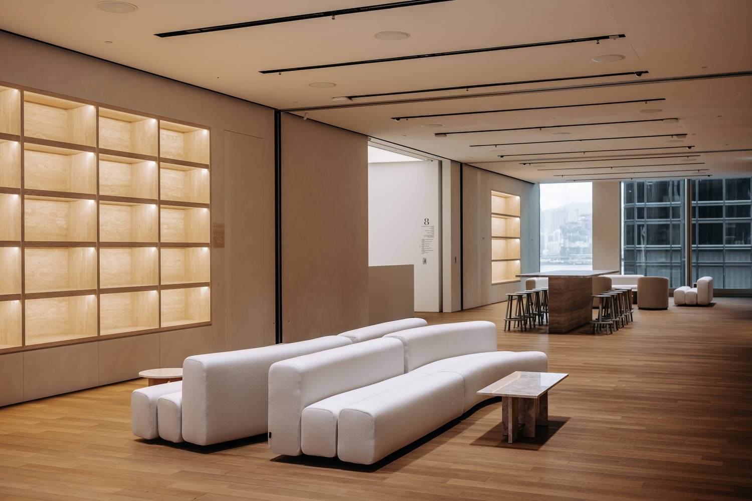 佳士得全新亚太区总部的空间布局匠心独运,不仅兼顾策展和运营功能,还有效增强与客户间的互动连结。设计师把主要接待处、艺廊和拍卖厅等面向公众的区域设于六楼和七楼;八楼设有客户专属空间,包括休息区、私人观赏区和全新艺术图书馆,部分楼层为办公区域,员工专区则安排在九楼,在六楼至八楼之间有一道特色楼梯贯穿其中,作为内部连接·方便艺廊、拍卖活动与客户专区之间的流动;楼梯间的弧形白色墙面上缀有特别设计的发光玻璃橱窗,用以聚焦展示重要的小型珍品。位于八楼和九楼的员工区域融汇了佳士得的「One Team 」理念,设计成开放式的工作空间。分工各异而相邻的小组围绕「广场(piazzas )」布局,「广场」设有会议室、电话亭以及休闲、用餐和工作等共享设施。这些「广场」的设置不但能促进团队间的交流合作,亦有助提升员工的健康福祉;而专属的便利空间,例如休息区和母婴室,则进一步保障了佳士得团队的健康和舒适。