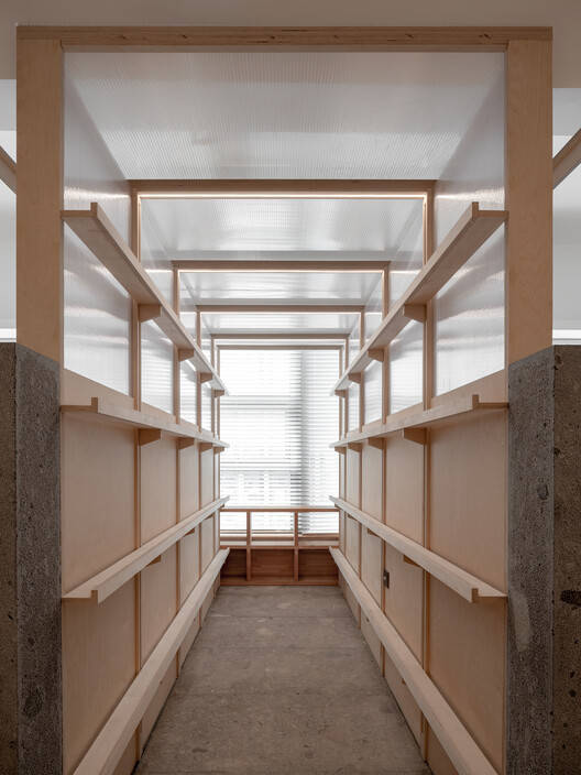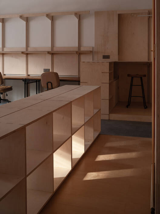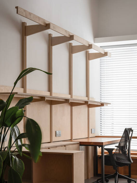 走廊的上半部通透,使其对室内光线的影响将至最低。腰线就顺势成为了整个工作室竖向立面的分隔线:下部由海洋板、洞洞板组成木质实面墙,提供工作时所需的视线遮挡,获得安稳与便捷。上部由白墙、透明阳光板与轻盈木构组成,形成通透却不割裂的立面,提供室内视线的穿越,让原本不大的工作室不会因为空间的隔断而显得拥挤狭小。