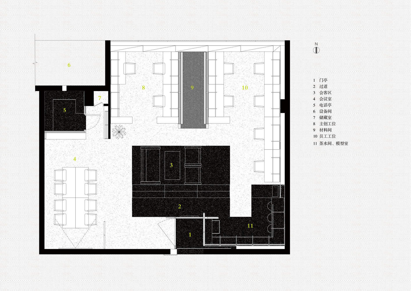 面对这个普通的甚至有点“无聊”的办公室,我们觉得必须得做点什么,好让它有趣一些。“盘中置景”就是一种方法。但置景是需要先建立规则的,这个得由空间次序说起:统一进出,分流隔断,以及“两话一茶”。