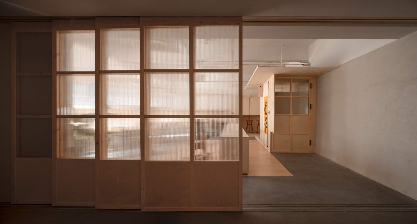 "Unified entry and exit" refers to our door. Due to facing our neighbors across the corridor, we have placed a "gate pavilion" here to avoid sight. The reason why it is called a "pavilion" is because there is a cover above it, a boundary around it, and a turning point for entry and exit. In order to reduce the heavy ceremony of "going to work", we use a hidden frame glass sliding door hidden in the wall to close the boundary, and then use an unlocked semi transparent wooden door as the actual entrance to the field, which is opened on weekdays.