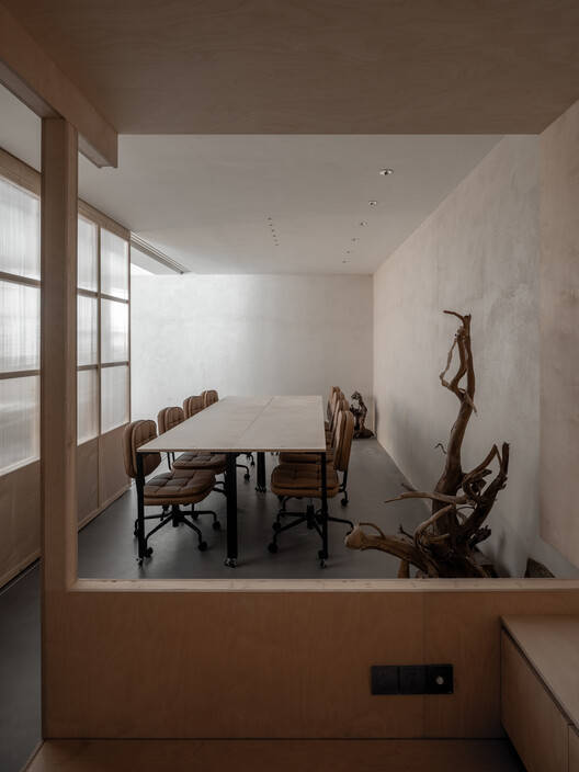 "Two Talks and One Tea" refers to meeting rooms, telephone booths, and tea bars, which are ancillary areas in daily office work. The two conversations are a thorough place for communication, so they are placed at that "special scale", with a lowered ceiling and movable wooden doors, allowing it to detach from the main space. Due to privacy requirements, the telephone booth is isolated as an independent space in this area, forming a box within a box. The telephone booth is the location with the least light in the entire office, but its outer side is the equipment platform. Therefore, we have opened a so-called air conditioning pipe hole here as a realistic version of cutting through walls to steal light. Therefore, this booth is named "Borrowing Light Pavilion".