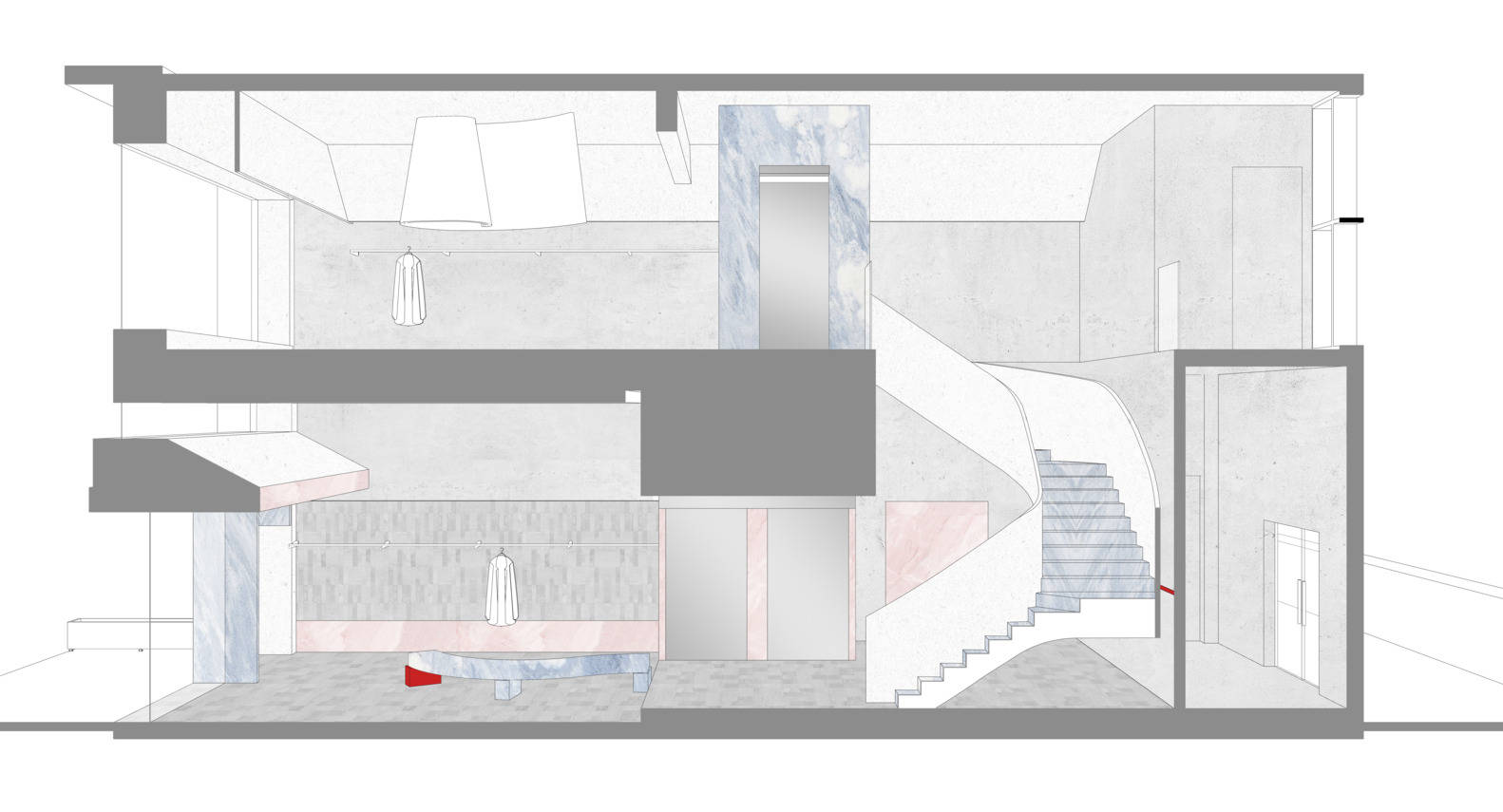 和谐的秩序中,红色线条与色块跃入视线,在整个空间中彼此呼应。它仿佛一个醒目的线索,是空间叙事中的隐藏故事线。由此步入二层,微斜的屋顶出现在视线里。采用同样的设计手法将建筑坡屋顶的结构显性的植入到空间里,结构性的强烈减弱了街边店的感受,空间脱离环境的独立性,在二层达到顶峰。将视线上移,吊挂的异形结构与下方桌面遥相呼应。仿佛脱离于空间的束缚,表达出“欢迎”之姿。螺旋状的异形结构释放出强烈的体积感,同时又有着腾空的轻盈。仿佛一出精彩的戏剧,缓缓拉开幕布。人们自然而然地在此落座停留,或带着好奇心观察空间的变化,或是试戴面前的饰物。在二楼的楼梯旁,「再造结构」又一次出现。在常规空间中作为电梯间的位置,其实暗藏着试衣间。它包裹在蓝色的石材之中,“篡改”大家对日常建筑的固有记忆。像是戏剧的番外篇,令人眼前一亮,又过目不忘。