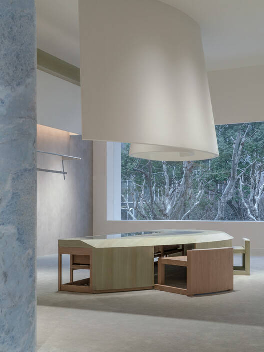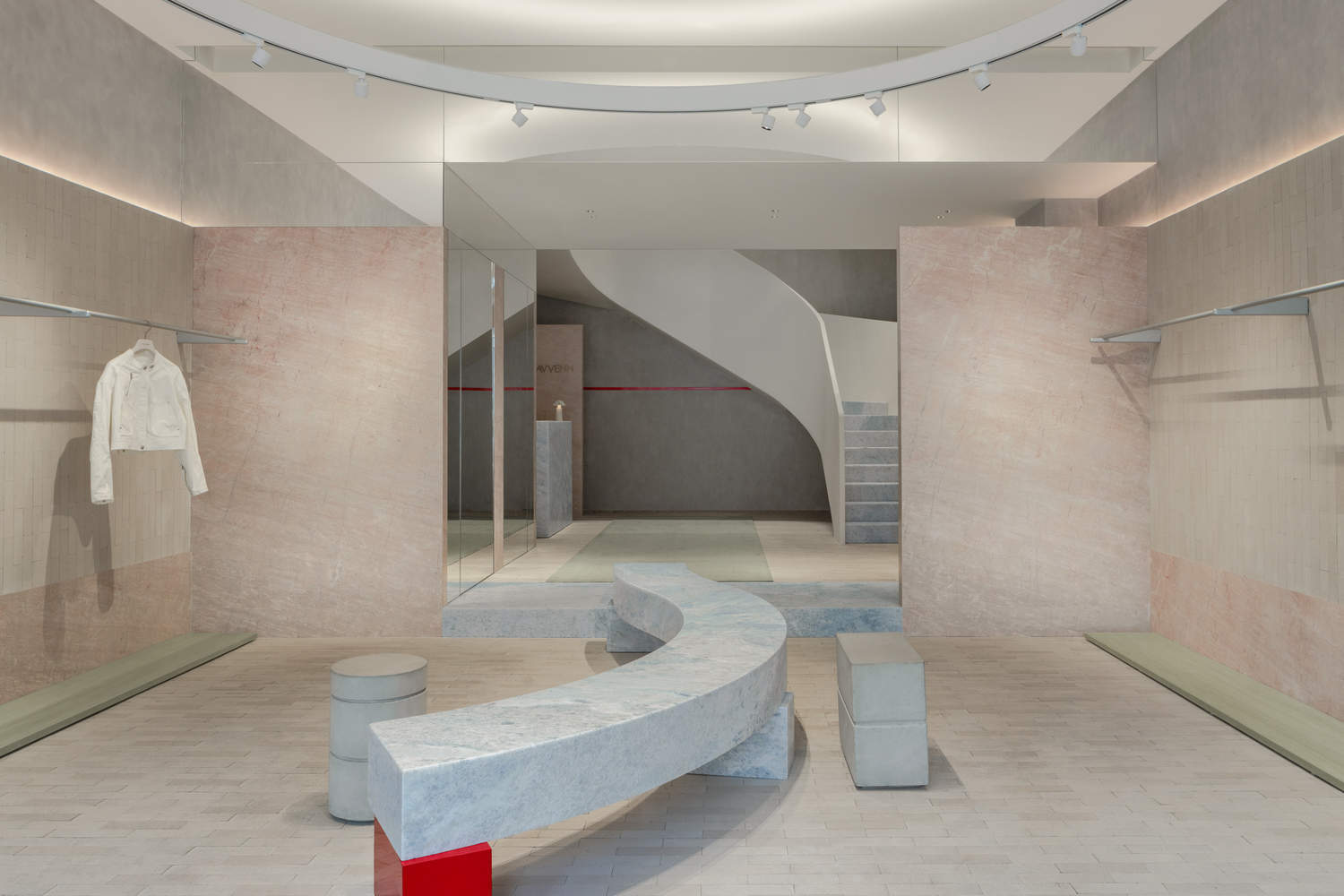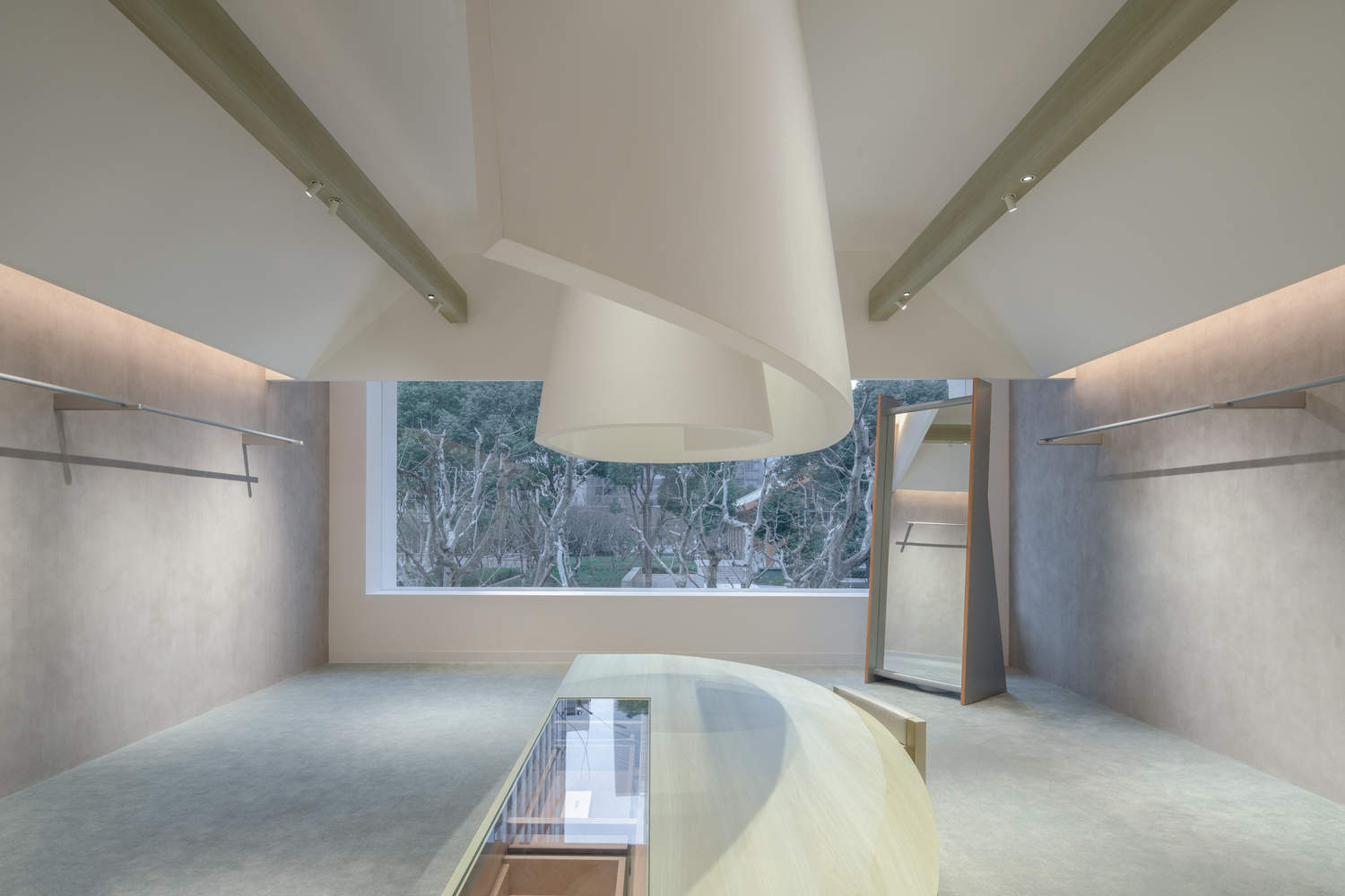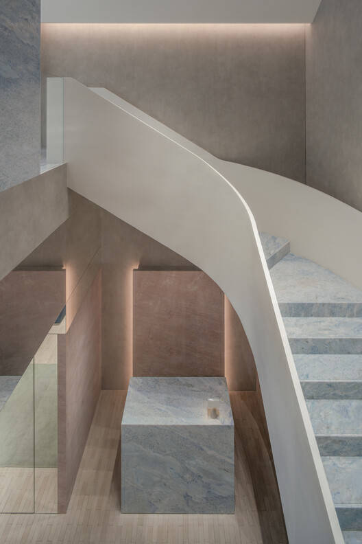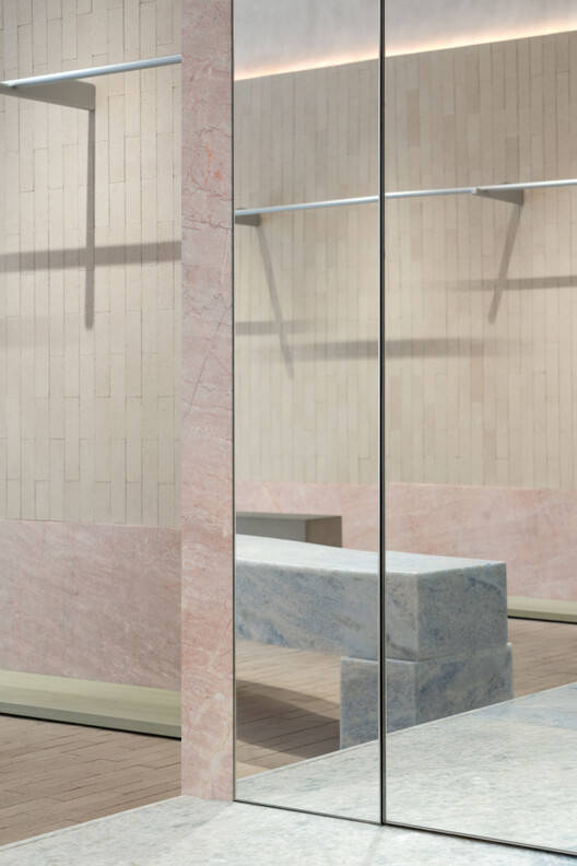 在道具的设计中,Sò Studio 寻求功能性与观赏性的平衡。材质、形态、结构、廓形彼此交织呼应,进而呈现出独特的美感,时刻引领着感官。设计师借助构建来影响建筑的轮廓。环绕一层空间,弧形石材道具占据了中心位。曲线自然勾勒,将空间轮廓映照得更加柔和,也调动着人的情绪感受。服装陈列区则通过不寻常的分割方式,强化了陈列面的界限与质感。超长的底板托起挂杆,无论挂满衣服还是悬空状态,它都不会破坏空间的美感。作为空间构建的一部分,So Studio 在设计中探讨材料的多样性与和谐感。设计师为材料做减法,灰度大理石材质的大面积使用,在保持空间连接感的同时,将不同区域自然划分。特别采用意大利回收砖,砖面保留天然气孔的粗粝感,因手工烧制而呈现出颜色的自然变化,带来随机性和不规则的感受,在井然的秩序中营造隐藏的惊喜感。从一层向二层漫步,侧目即可望见镜面元素。它如同一面立体的水系,让空间充满虚实的变换。空间中的一切结构,包括观者自身,都化身镜中的风景,像一幅画卷徐徐展开。