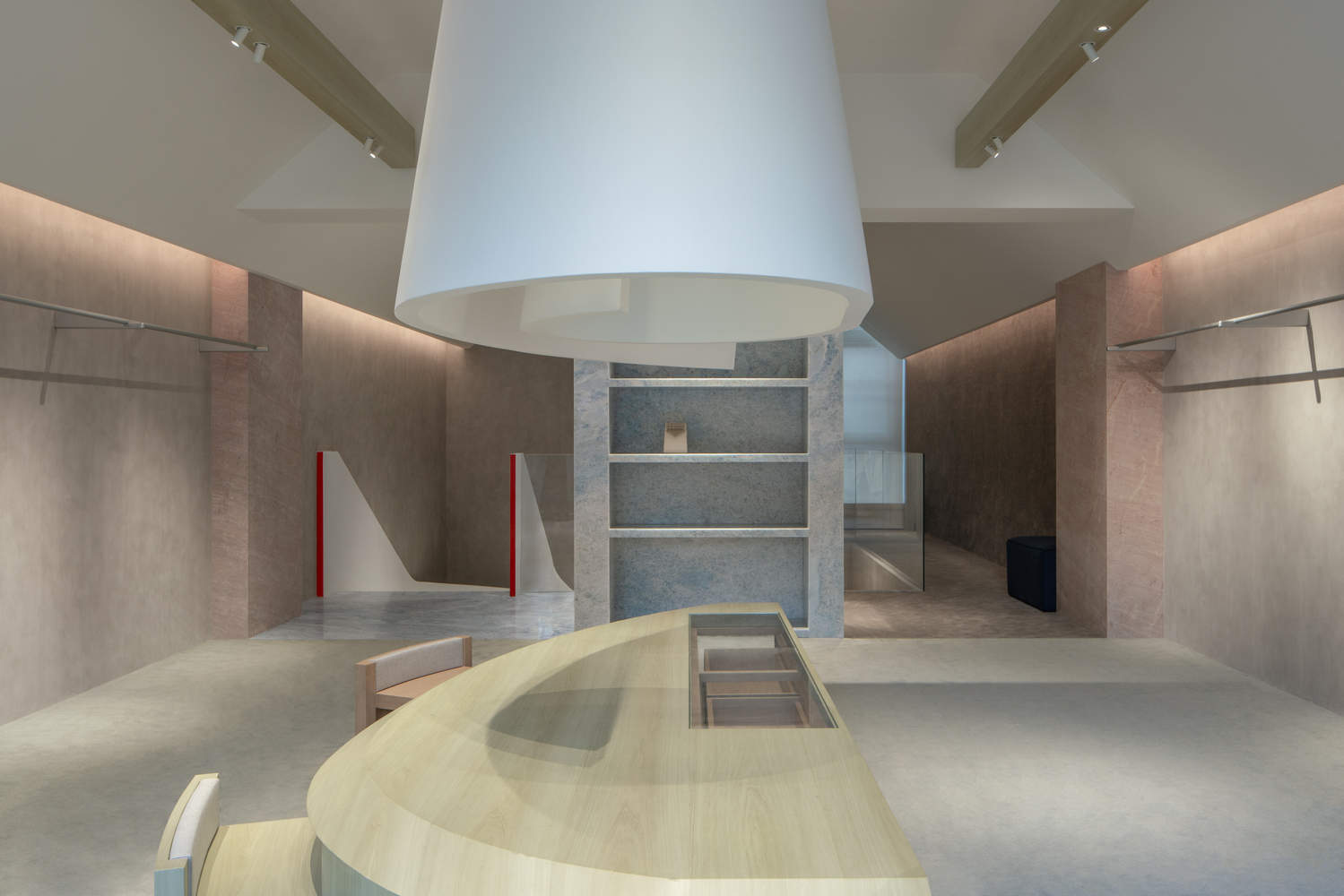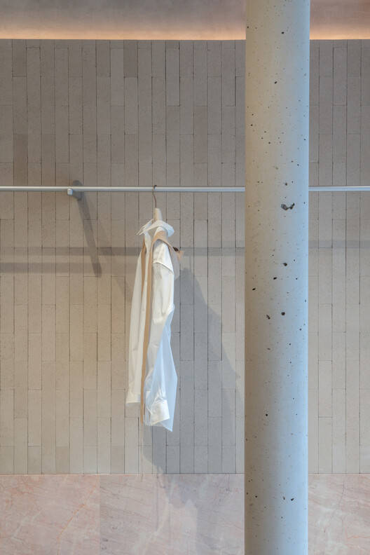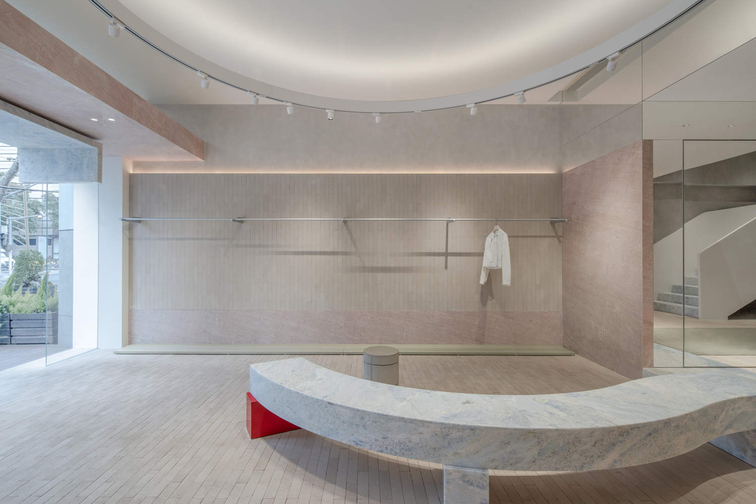 In prop design, S ò Studio seeks a balance between functionality and aesthetics.. The interweaving and echoing of material, form, structure, and silhouette present a unique beauty that constantly guides the senses. Designers use construction to influence the outline of buildings. Surrounding a layer of space, curved stone props occupy the center position. The curve naturally outlines the spatial contour, reflecting it more softly and also arousing people's emotional feelings. The clothing display area strengthens the boundaries and texture of the display surface through unusual segmentation methods. The ultra long bottom plate supports the hanging rod, which will not destroy the beauty of the space whether it is fully covered with clothes or suspended. As part of spatial construction, So Studio explores the diversity and harmony of materials in its design. The designer performs subtraction on the material, using a large area of grayscale marble material to naturally divide different areas while maintaining spatial connectivity. Specially using Italian recycled bricks, the brick surface retains the rough texture of natural pores, and presents natural color changes due to manual firing, bringing a sense of randomness and irregularity, creating a hidden sense of surprise in a well ordered environment. Strolling from the first floor to the second floor, you can see the mirror elements from the side. It is like a three-dimensional water system, filling the space with virtual and real transformations. All structures in space, including the viewer themselves, are transformed into scenery in a mirror, unfolding slowly like a painting scroll.