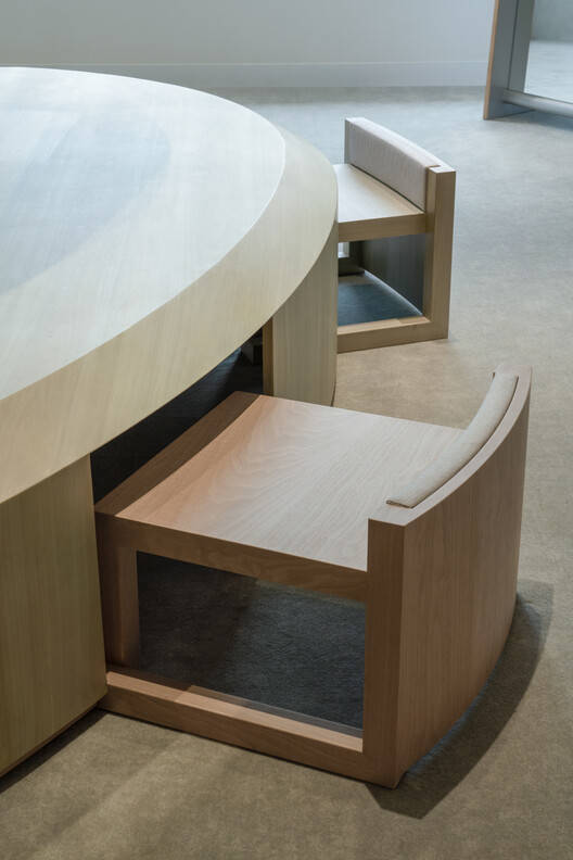 Sò Studio 善于营造结构的变化,在动线中去体会空间的戏剧感。设计师在空间中再造一个小结构,仿佛悬空的“屋顶”。推门而入,极具延伸感的结构呈现出欢迎的姿态,穿过粉色大理石挑檐,整个空间情绪以平静为始。继续向前延伸,混凝土浇筑立柱撑起挑檐,以一小块金属盖板轻巧连接。特别设计出的“缝隙”,让屋檐与立柱之间呈现出近似悬空的关系,大大消解了混凝土的实感,但同时支撑又能体现出屋檐本身的重量,让看似厚重的石材,散发出扑面而来的轻盈感。