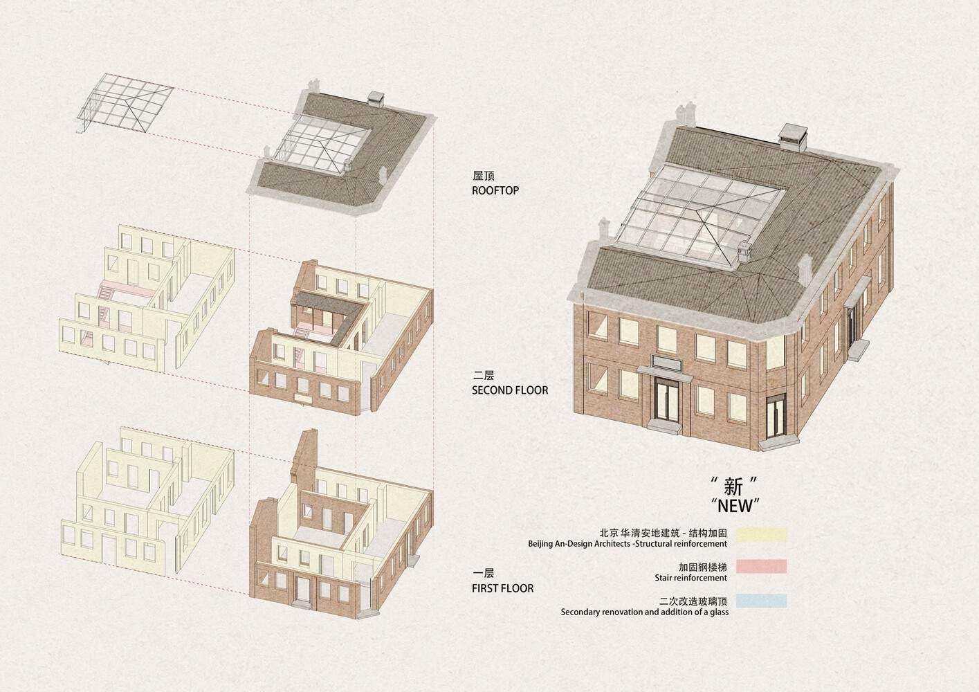 改造策略:作为大连东关街的百年历史建筑,设计的首要难题是在严苛细致的历史建筑保护的规定下,如何在不破坏原有建筑外形、结构及展现历史印记墙面的基础上对其修缮与更新,恢复其往日的繁华与活力。