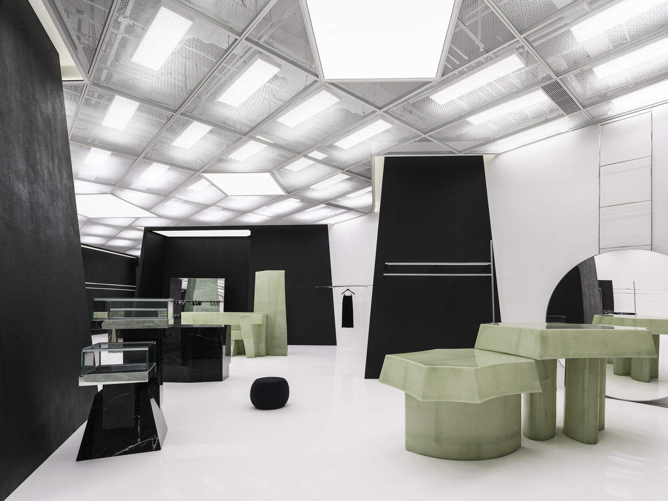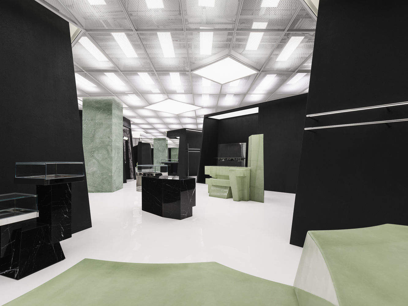 “基石”概念将空间抽象为支撑的地下根基,如嶙峋巨石般的店铺林立。中央区域的五根立柱被绿色大理石包裹,宛如巨石中迸发的结晶体,赋予空间稳固而蓬勃的生命力。建筑如巨型地下岩层拔地而起,错落生长的几何体块化身嶙峋洞窟。这场空间实验既暗合了广州塔直指苍穹的力学叙事,又以极简主义手法消解商业空间的程式化表达,让每间店中店成为支撑城市想象的未来化石。天花板的白色双层网状材质、隐藏式灯光与纯白的地板共同演绎“云雾”的轻盈与朦胧,行走其间,仿佛踏云而行。倾斜的天花设计从入口处缓缓抬升,如同被风卷动的云层,赋予空间动态的呼吸感。设计师从中国传统玉石中汲取灵感,将东方美学悄然植入现代空间。散落的绿色玻璃钢装置如同晶莹的宝石,点缀其中,平衡冷冽的基调,增添一抹温润的盎然生机。