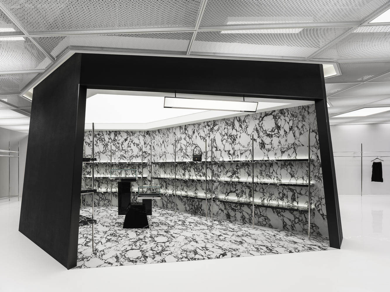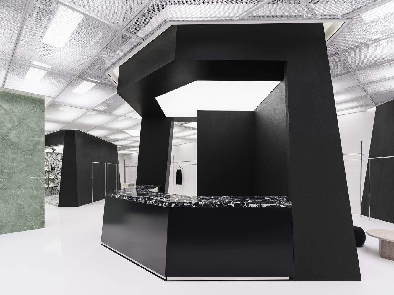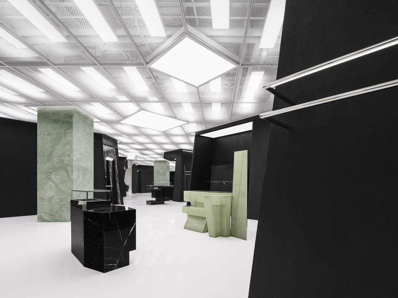 通高的镜面不锈钢墙立于VIP室对面,镜子不仅是功能道具,更隐喻时尚的多维表达——每一套穿搭都是新的自我投射。位于另一隅的收银台坐拥开阔视野,让工作人员迅速响应,随时为顾客提供贴心周到的服务。在这里,顾客不是消费者,而是空间叙事的参与者。设计师模糊空间装置与商品的界限,服装陈列于凿刻感的石台上,宛如美术馆展品。手袋被悬挂在透光云石壁龛中,光影流转间,皮革纹理成为空间叙事的一部分。