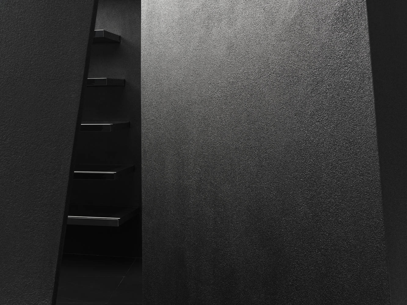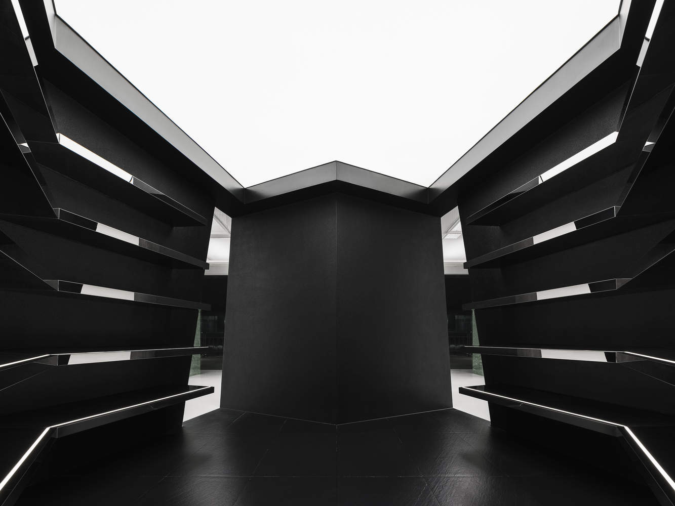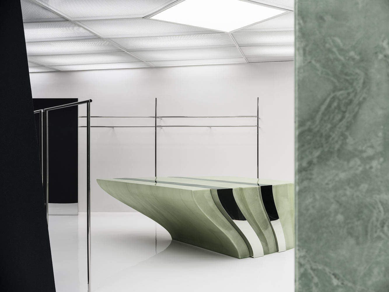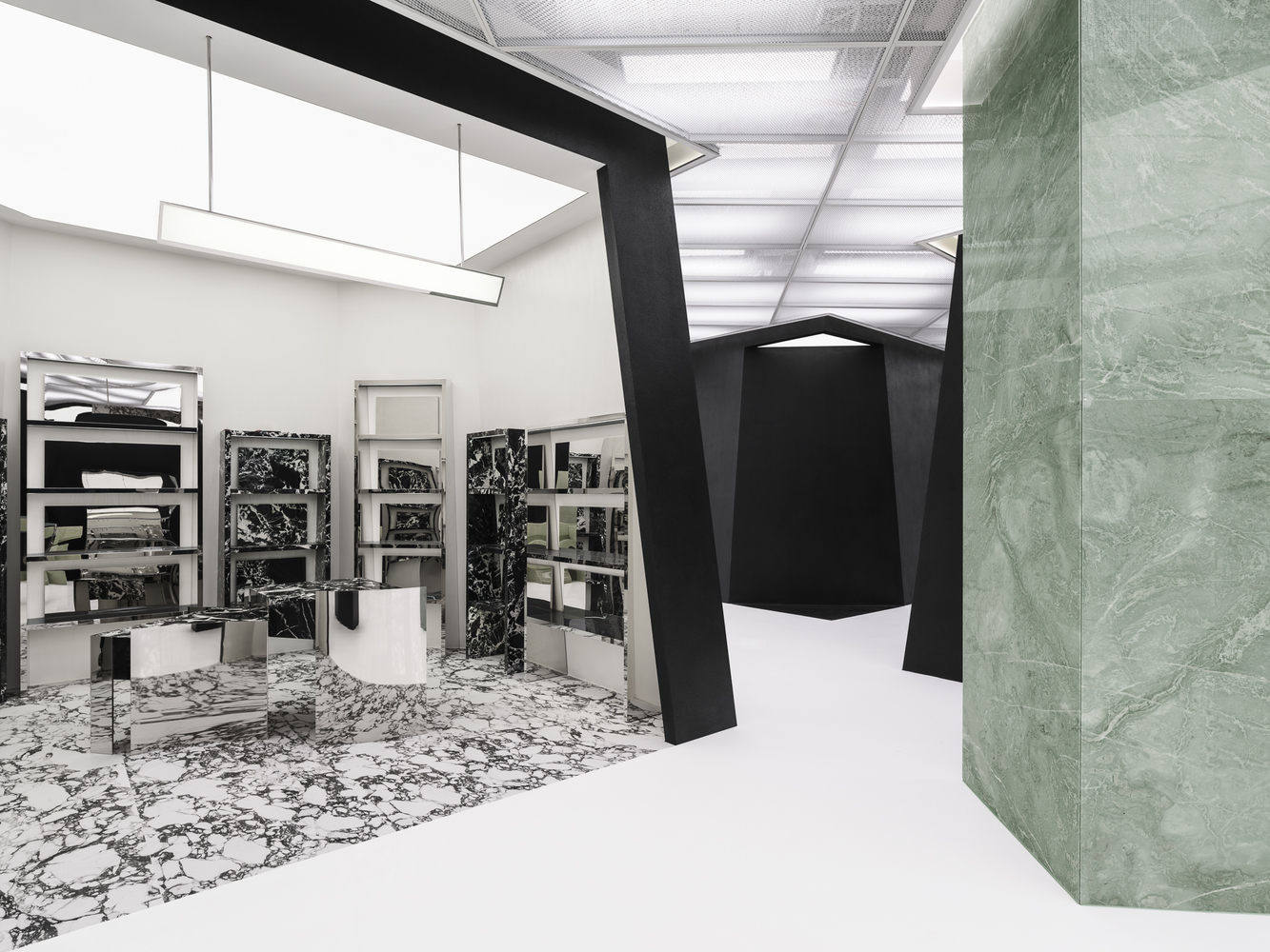 通高的镜面不锈钢墙立于VIP室对面,镜子不仅是功能道具,更隐喻时尚的多维表达——每一套穿搭都是新的自我投射。位于另一隅的收银台坐拥开阔视野,让工作人员迅速响应,随时为顾客提供贴心周到的服务。在这里,顾客不是消费者,而是空间叙事的参与者。设计师模糊空间装置与商品的界限,服装陈列于凿刻感的石台上,宛如美术馆展品。手袋被悬挂在透光云石壁龛中,光影流转间,皮革纹理成为空间叙事的一部分。