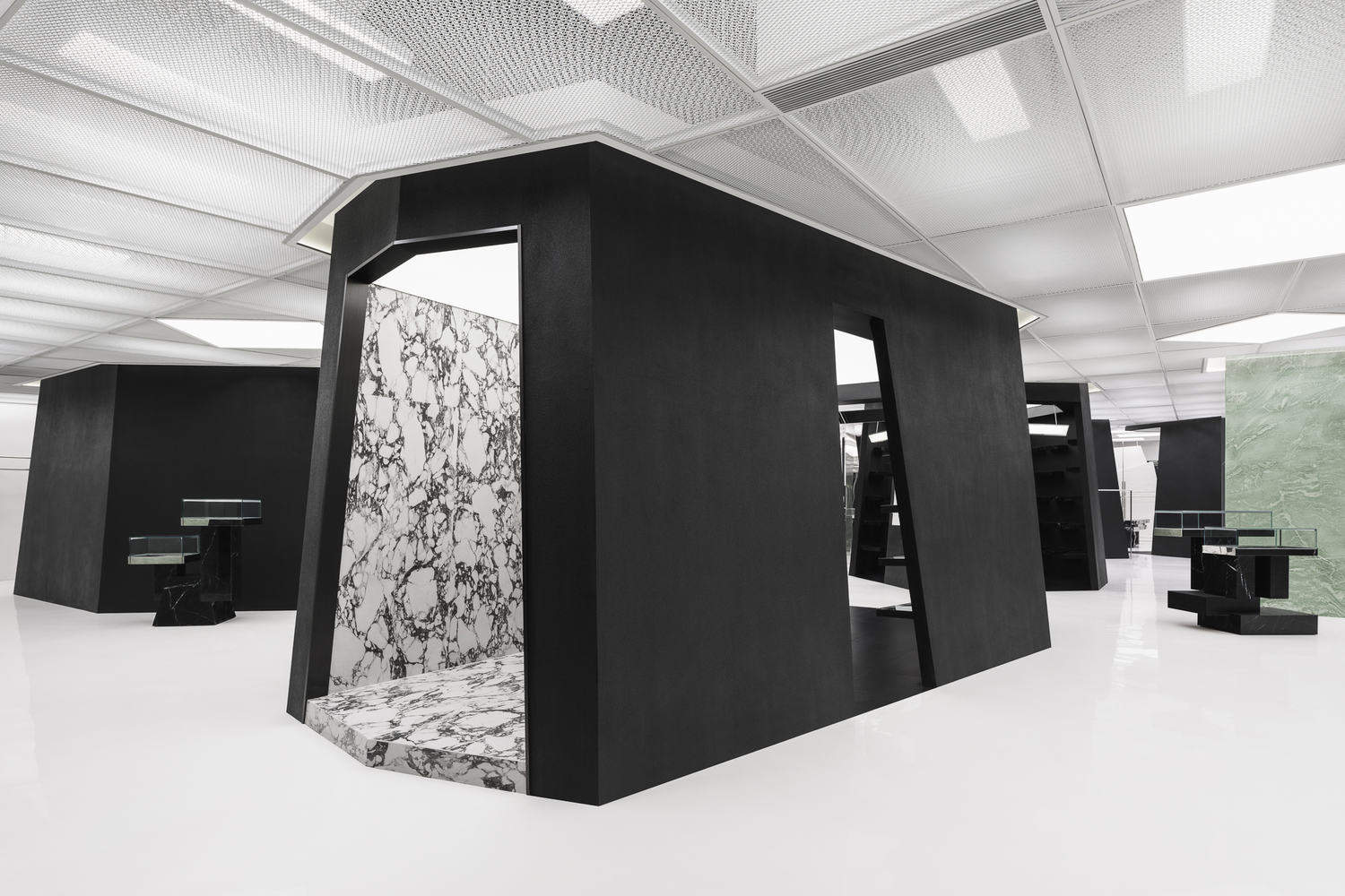 非对称布局消解了传统店铺的规整感,顾客如同在秘境中寻宝,转角即是天地。从材质选择到空间动线,从陈列方式到灯光布局,每个“盒子”既独立存在又彼此串联,通过多层次的布局,引导顾客发现每个品牌独特的故事与气质。设计团队执笔的每一个体块都经过深思熟虑,独具创意的“巨石”仿佛是从大自然的鬼斧神工中汲取灵感,店中店形态各异,或包裹华丽大理石,或覆盖艺术涂料,或嵌入镜面装置,共同构成了一个既现代又充满艺术气息的购物空间。