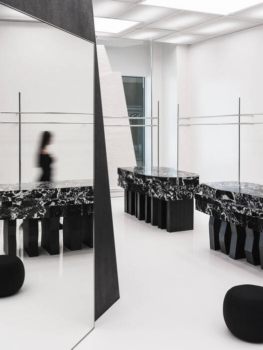 The tall mirrored stainless steel wall stands opposite the VIP room, and the mirror is not only a functional prop, but also a metaphorical expression of fashion in multiple dimensions - every outfit is a new self projection. The cash register located in another corner has a wide view, allowing staff to respond quickly and provide attentive service to customers at any time. Here, customers are not consumers, but participants in the spatial narrative. Designers blur the boundaries between spatial installations and products, and clothing is displayed on chiseled stone platforms, resembling exhibits in an art museum. The handbag is suspended in a translucent marble niche, where light and shadow flow, and the leather texture becomes a part of the spatial narrative.