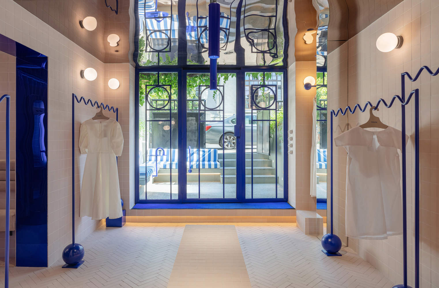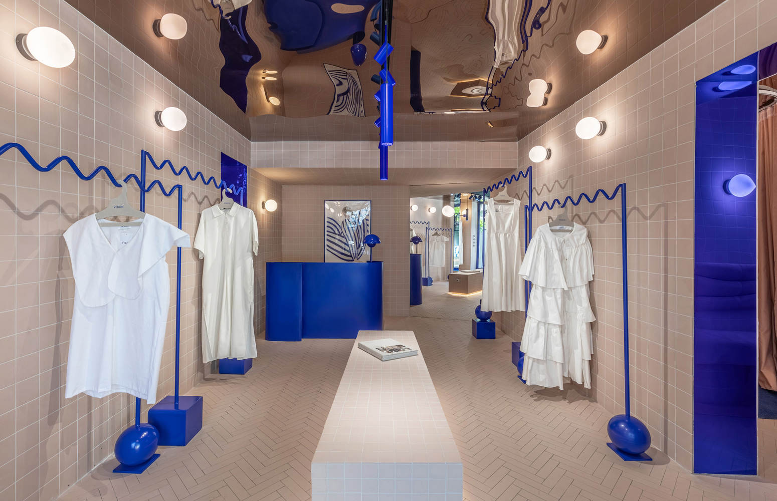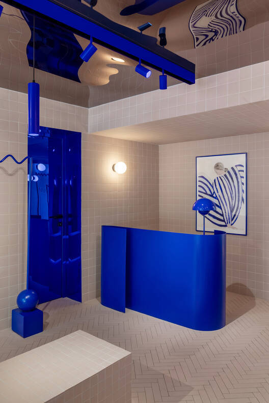 In order to maintain the fluidity of the space, metal furniture is designed to be separated from the walls. The clothing rack is made of wavy metal rods, and the wavy design limits the maximum number of products displayed, thereby maintaining a refreshing atmosphere in the space. The reception desk is made of a blue metal plate that wraps around the counter and is separated from the wall. Even the fitting room is an independent element, composed of a separate mirror surrounded by curtains.